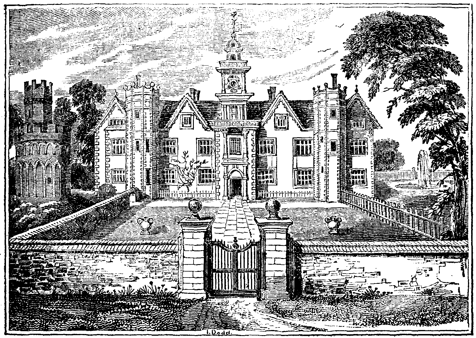 The present mansion is partly ancient, and partly modern, and was very lately the property of Sir William Curtis, Bart. Up to the period at which the castle is represented in the engraving, the building must have undergone many alterations, as the tower on the left, and the two octagonal and centre towers, will prove. The grounds there appear laid out in the trim fashion of the seventeenth century, and ornamented with fountains, vases, &c.