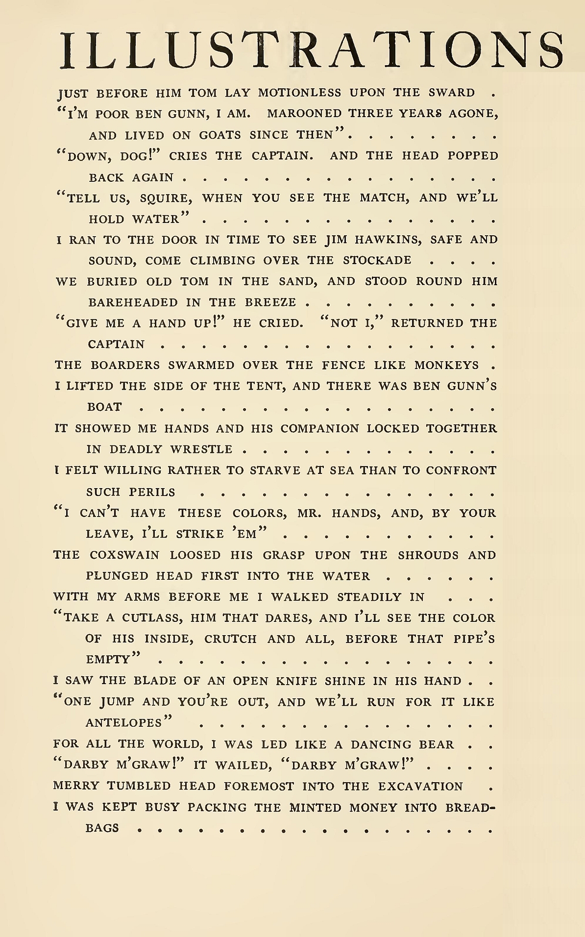 At first I had supposed “the dead man’s chest” to be that identical big box of his upstairs in the front room, and the thought had been mingled in my nightmares with that of the one-legged seafaring man. But by this time we had all long ceased to pay any particular notice to the song; it was new, that night, to nobody but Dr. Livesey, and on him I observed it did not produce an agreeable effect, for he looked up for a moment quite angrily before he went on with his talk to old Taylor, the gardener, on a new cure for the rheumatics. In the meantime, the captain gradually brightened up at his own music, and at last flapped his hand upon the table before him in a way we all knew to mean silence. The voices stopped at once, all but Dr. Livesey’s; he went on as before speaking clear and kind and drawing briskly at his pipe between every word or two. The captain glared at him for a while, flapped his hand again, glared still harder, and at last broke out with a villainous, low oath, “Silence, there, between decks!”