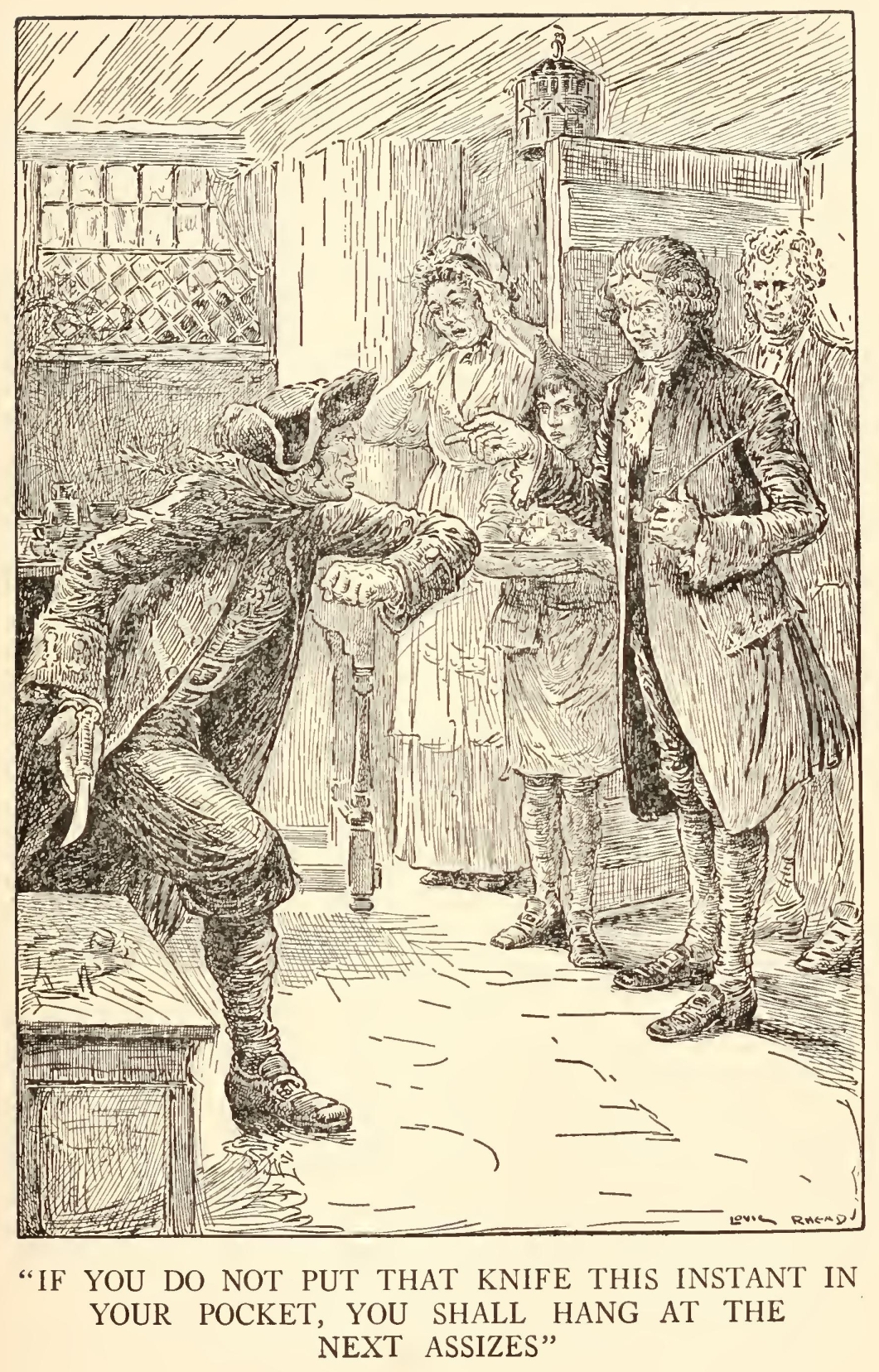 The expression of his face as he said these words was not at all pleasant, and I had my own reasons for thinking that the stranger was mistaken, even supposing he meant what he said. But it was no affair of mine, I thought; and besides, it was difficult to know what to do. The stranger kept hanging about just inside the inn door, peering round the corner like a cat waiting for a mouse. Once I stepped out myself into the road, but he immediately called me back, and as I did not obey quick enough for his fancy, a most horrible change came over his tallowy face, and he ordered me in with an oath that made me jump. As soon as I was back again he returned to his former manner, half fawning, half sneering, patted me on the shoulder, told me I was a good boy and he had taken quite a fancy to me. “I have a son of my own,” said he, “as like you as two blocks, and he’s all the pride of my ’art. But the great thing for boys is discipline, sonny—discipline. Now, if you had sailed along of Bill, you wouldn’t have stood there to be spoke to twice—not you. That was never Bill’s way, nor the way of sich as sailed with him. And here, sure enough, is my mate Bill, with a spy-glass under his arm, bless his old ’art, to be sure. You and me’ll just go back into the parlour, sonny, and get behind the door, and we’ll give Bill a little surprise—bless his ’art, I say again.”