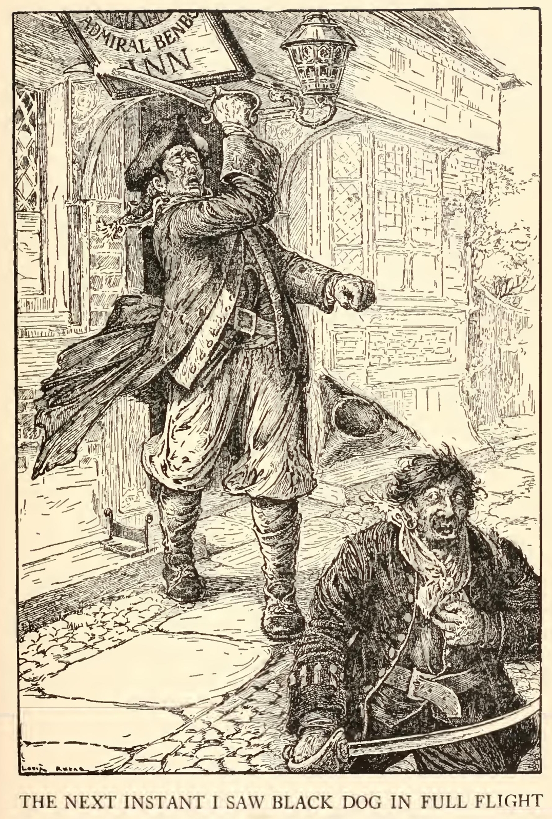 I remember him as if it were yesterday, as he came plodding to the inn door, his sea-chest following behind him in a hand-barrow—a tall, strong, heavy, nut-brown man, his tarry pigtail falling over the shoulder of his soiled blue coat, his hands ragged and scarred, with black, broken nails, and the sabre cut across one cheek, a dirty, livid white. I remember him looking round the cove and whistling to himself as he did so, and then breaking out in that old sea-song that he sang so often afterwards: