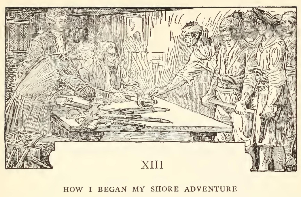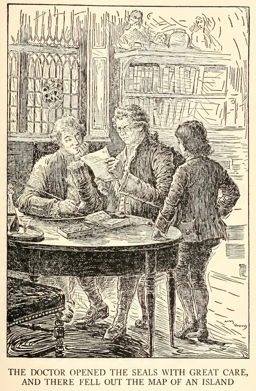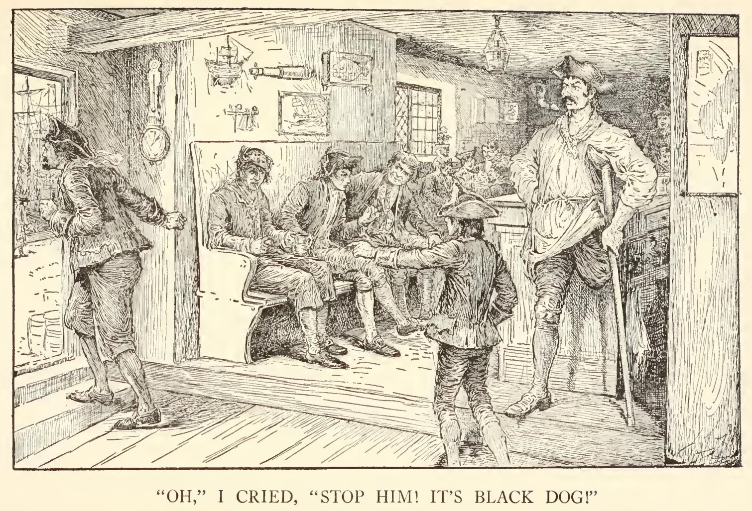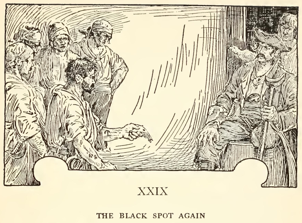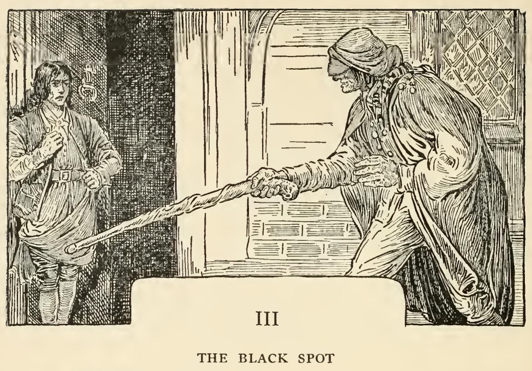 “Well,” said he, “my mate Bill would be called the captain, as like as not. He has a cut on one cheek and a mighty pleasant way with him, particularly in drink, has my mate Bill. We’ll put it, for argument like, that your captain has a cut on one cheek—and we’ll put it, if you like, that that cheek’s the right one. Ah, well! I told you. Now, is my mate Bill in this here house?”