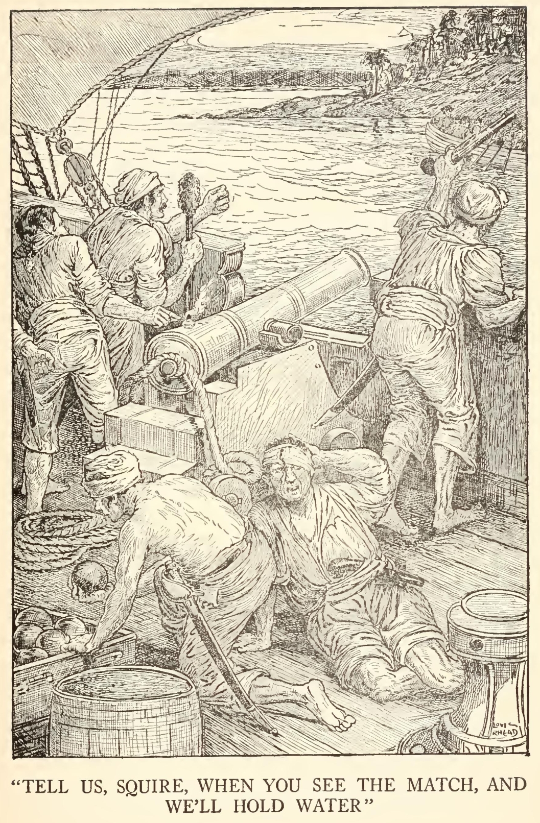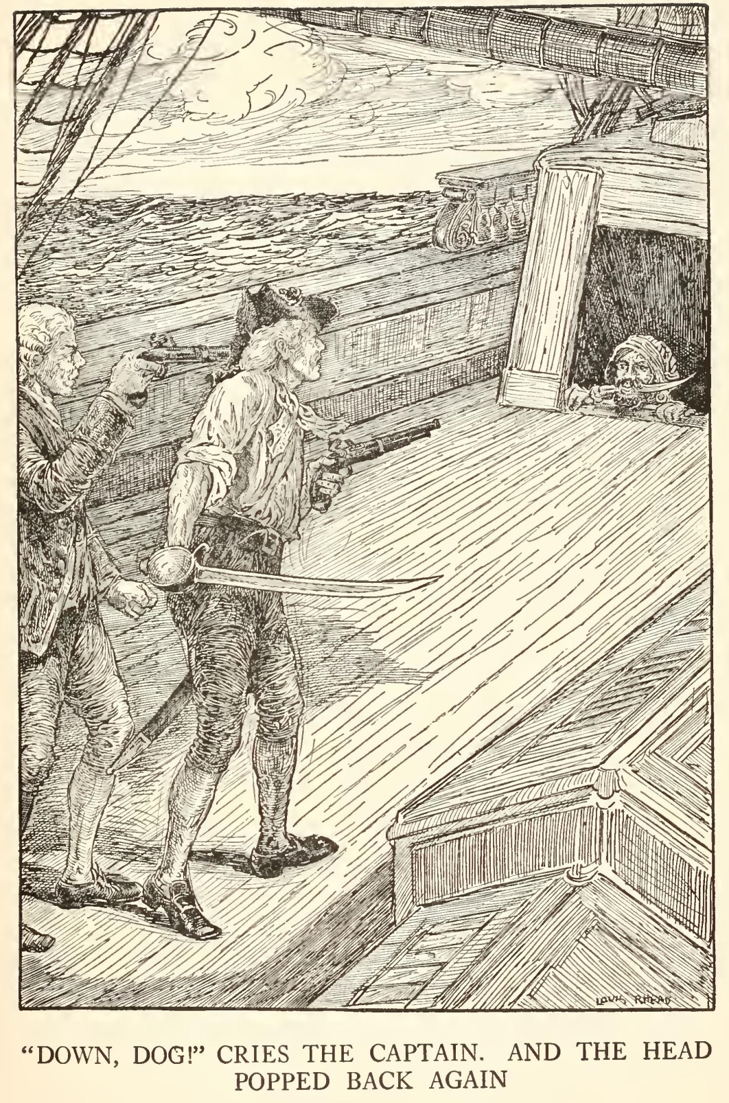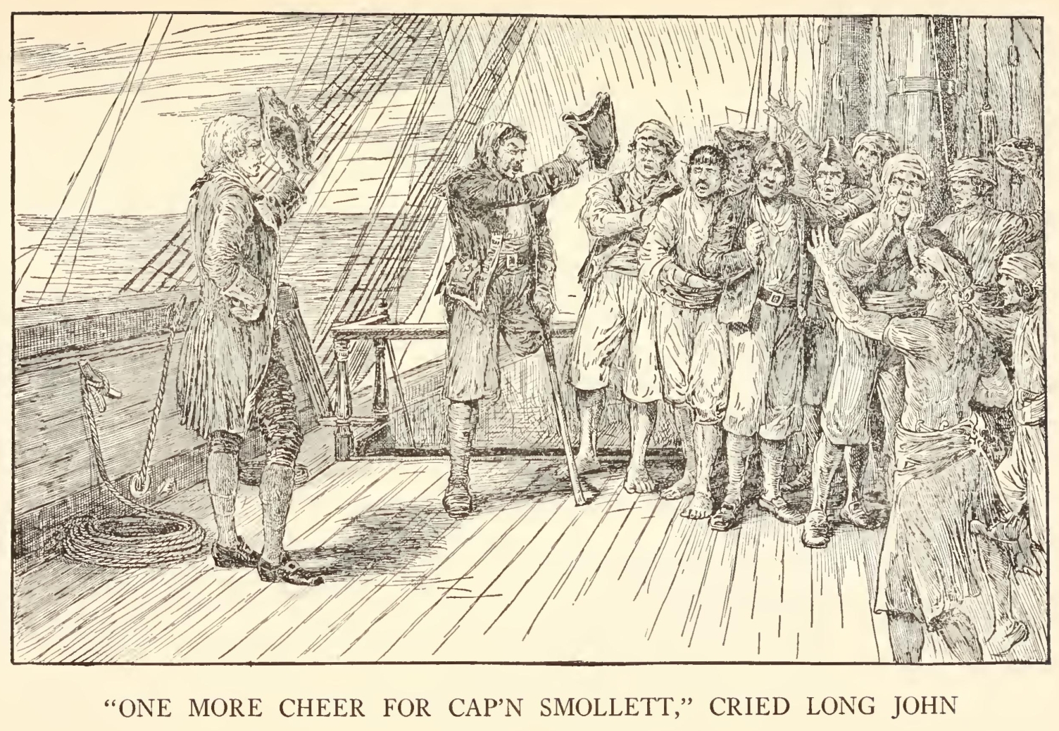 “Well,” said he, “my mate Bill would be called the captain, as like as not. He has a cut on one cheek and a mighty pleasant way with him, particularly in drink, has my mate Bill. We’ll put it, for argument like, that your captain has a cut on one cheek—and we’ll put it, if you like, that that cheek’s the right one. Ah, well! I told you. Now, is my mate Bill in this here house?”