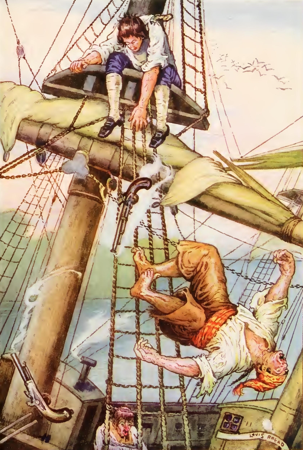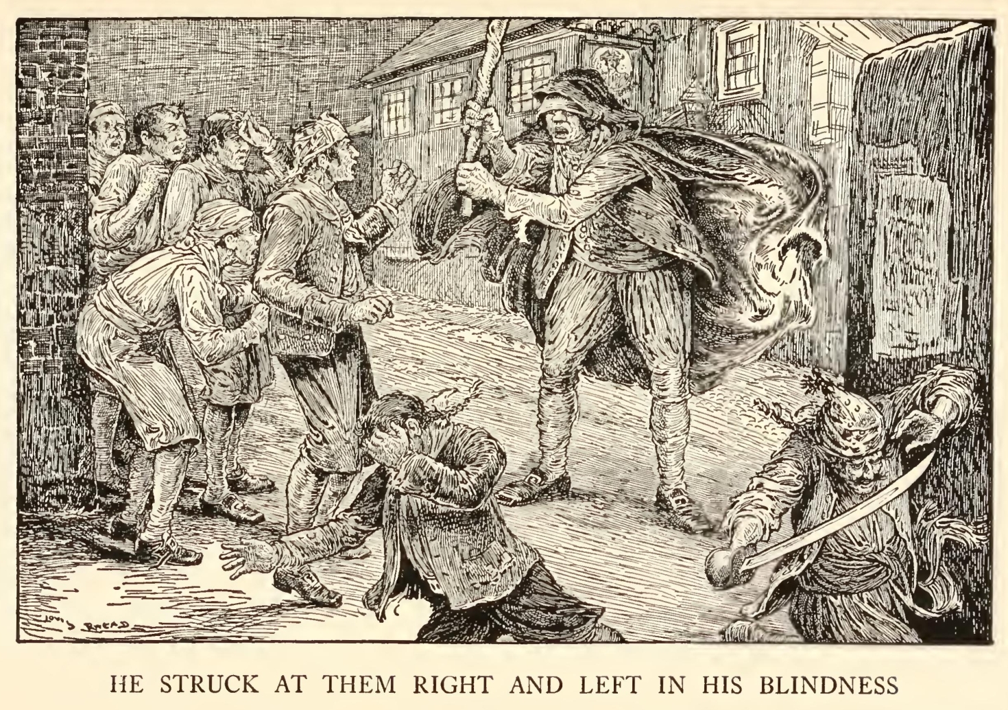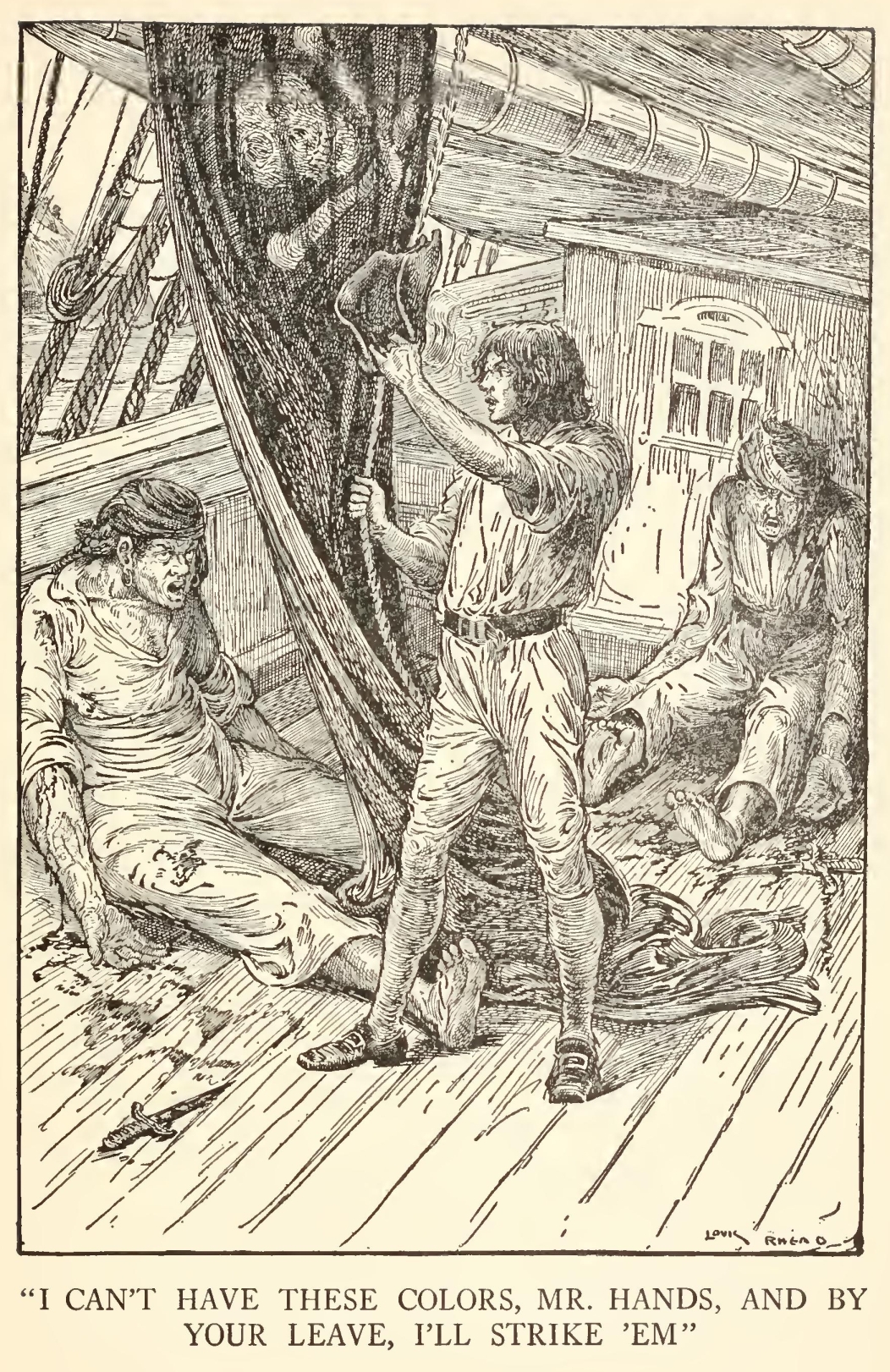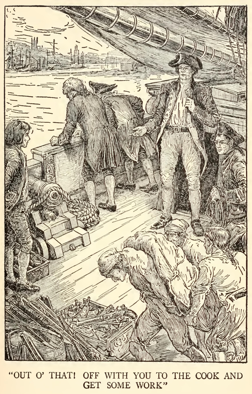 “Well,” said he, “my mate Bill would be called the captain, as like as not. He has a cut on one cheek and a mighty pleasant way with him, particularly in drink, has my mate Bill. We’ll put it, for argument like, that your captain has a cut on one cheek—and we’ll put it, if you like, that that cheek’s the right one. Ah, well! I told you. Now, is my mate Bill in this here house?”