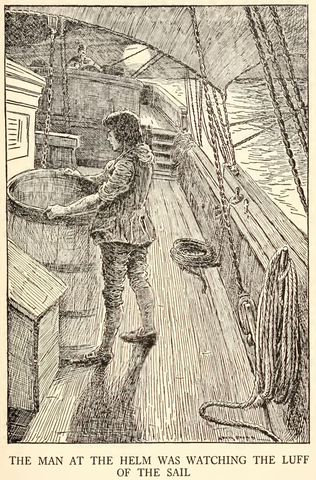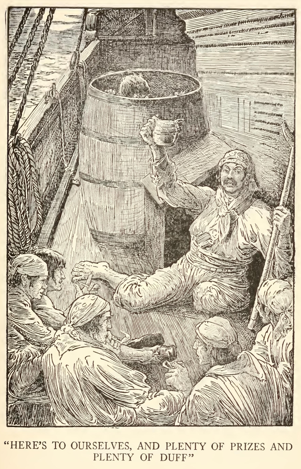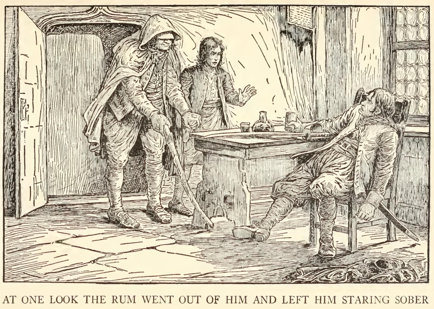 But though I was so terrified by the idea of the seafaring man with one leg, I was far less afraid of the captain himself than anybody else who knew him. There were nights when he took a deal more rum and water than his head would carry; and then he would sometimes sit and sing his wicked, old, wild sea-songs, minding nobody; but sometimes he would call for glasses round and force all the trembling company to listen to his stories or bear a chorus to his singing. Often I have heard the house shaking with “Yo-ho-ho, and a bottle of rum,” all the neighbours joining in for dear life, with the fear of death upon them, and each singing louder than the other to avoid remark. For in these fits he was the most overriding companion ever known; he would slap his hand on the table for silence all round; he would fly up in a passion of anger at a question, or sometimes because none was put, and so he judged the company was not following his story. Nor would he allow anyone to leave the inn till he had drunk himself sleepy and reeled off to bed.
