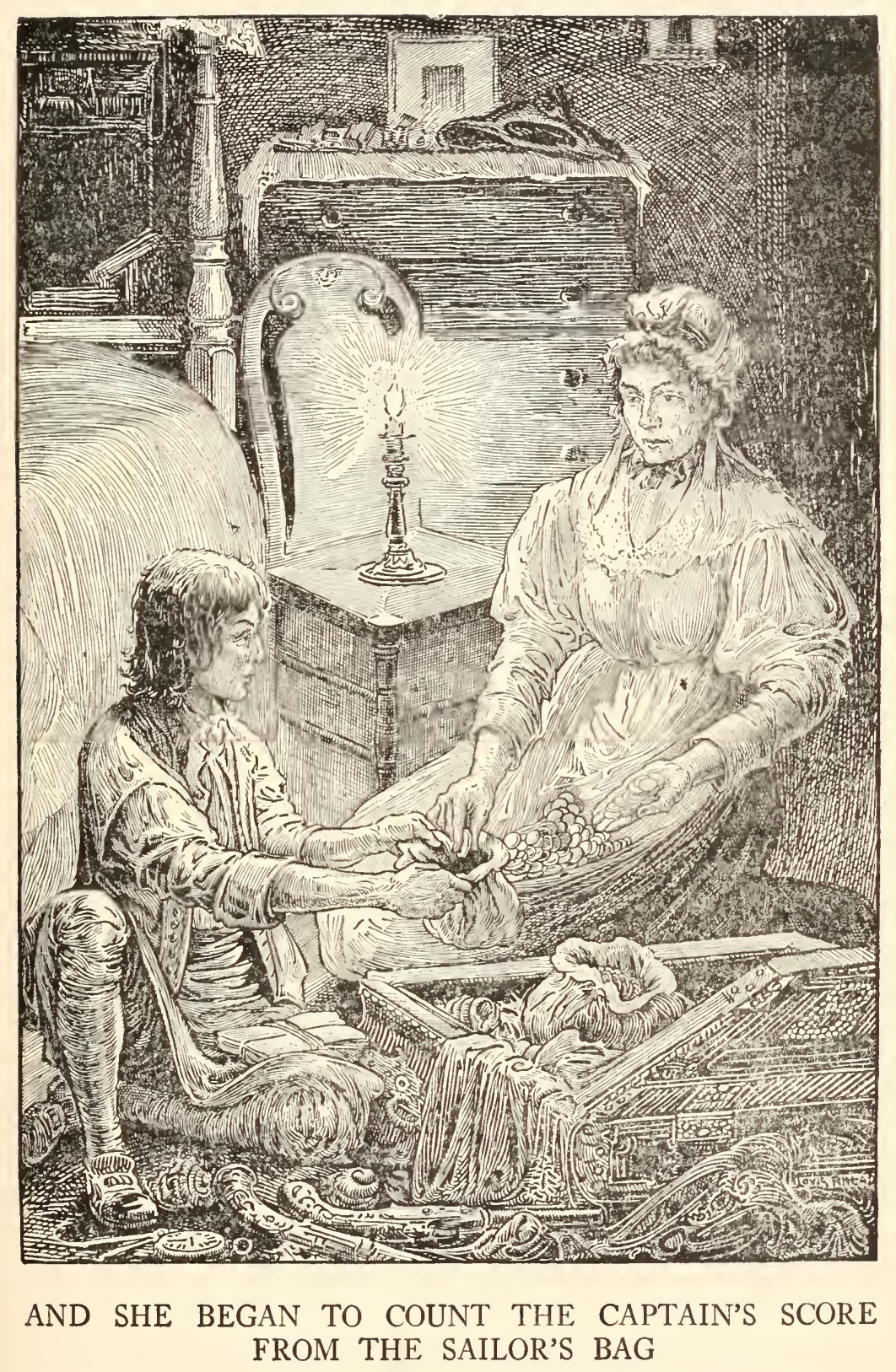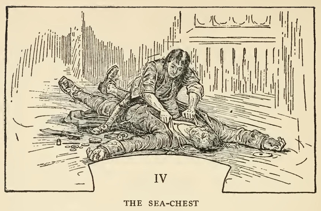 “Well, then,” said he, “this is the berth for me. Here you, matey,” he cried to the man who trundled the barrow; “bring up alongside and help up my chest. I’ll stay here a bit,” he continued. “I’m a plain man; rum and bacon and eggs is what I want, and that head up there for to watch ships off. What you mought call me? You mought call me captain. Oh, I see what you’re at—there”; and he threw down three or four gold pieces on the threshold. “You can tell me when I’ve worked through that,” says he, looking as fierce as a commander.
