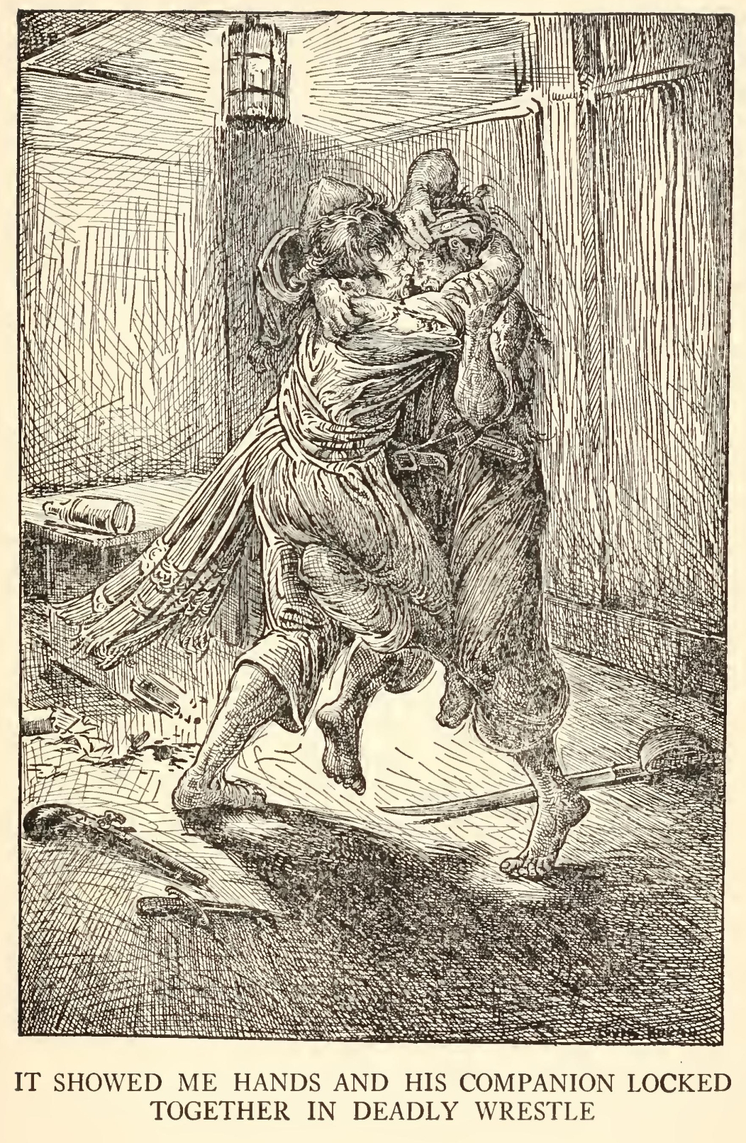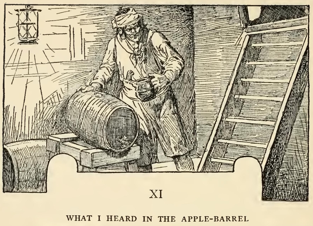 So saying, the stranger backed along with me into the parlour and put me behind him in the corner so that we were both hidden by the open door. I was very uneasy and alarmed, as you may fancy, and it rather added to my fears to observe that the stranger was certainly frightened himself. He cleared the hilt of his cutlass and loosened the blade in the sheath; and all the time we were waiting there he kept swallowing as if he felt what we used to call a lump in the throat.