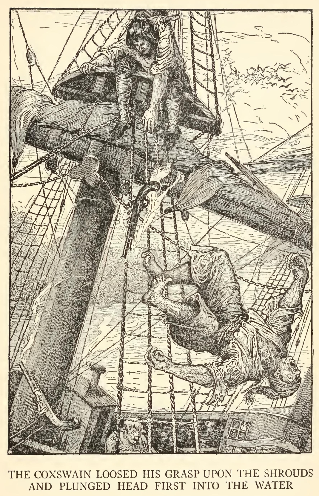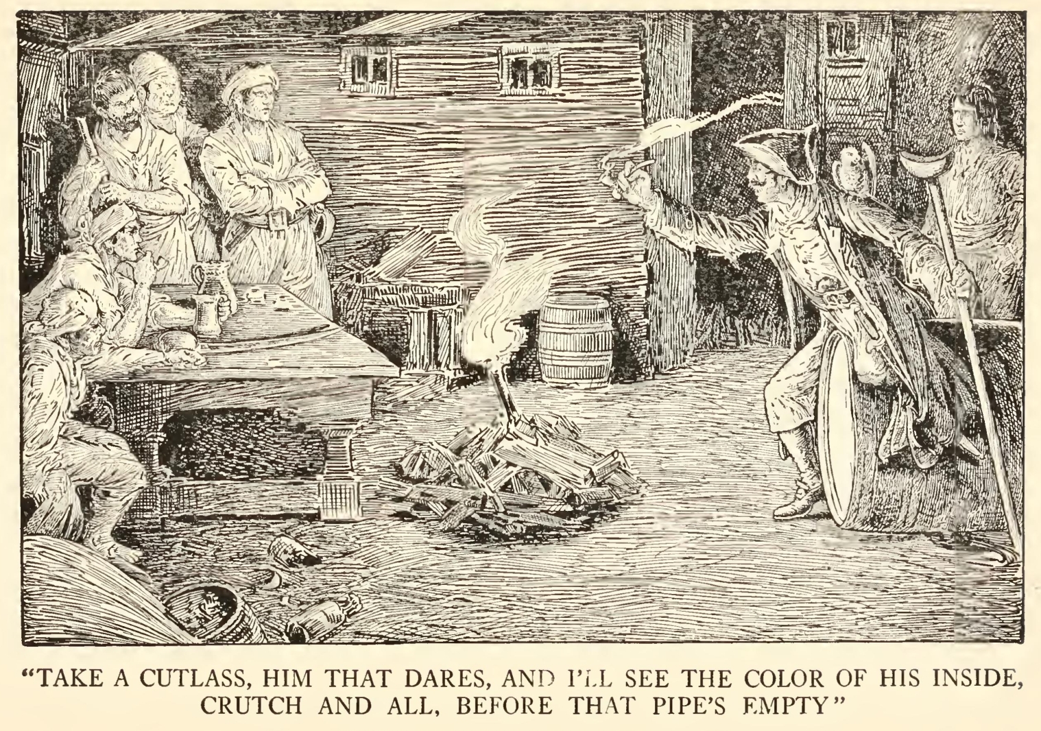 His stories were what frightened people worst of all. Dreadful stories they were—about hanging, and walking the plank, and storms at sea, and the Dry Tortugas, and wild deeds and places on the Spanish Main. By his own account he must have lived his life among some of the wickedest men that God ever allowed upon the sea, and the language in which he told these stories shocked our plain country people almost as much as the crimes that he described. My father was always saying the inn would be ruined, for people would soon cease coming there to be tyrannized over and put down, and sent shivering to their beds; but I really believe his presence did us good. People were frightened at the time, but on looking back they rather liked it; it was a fine excitement in a quiet country life, and there was even a party of the younger men who pretended to admire him, calling him a “true sea-dog” and a “real old salt” and such like names, and saying there was the sort of man that made England terrible at sea.