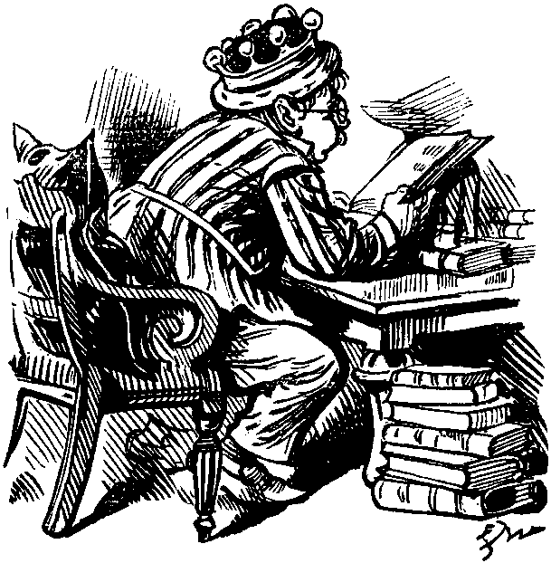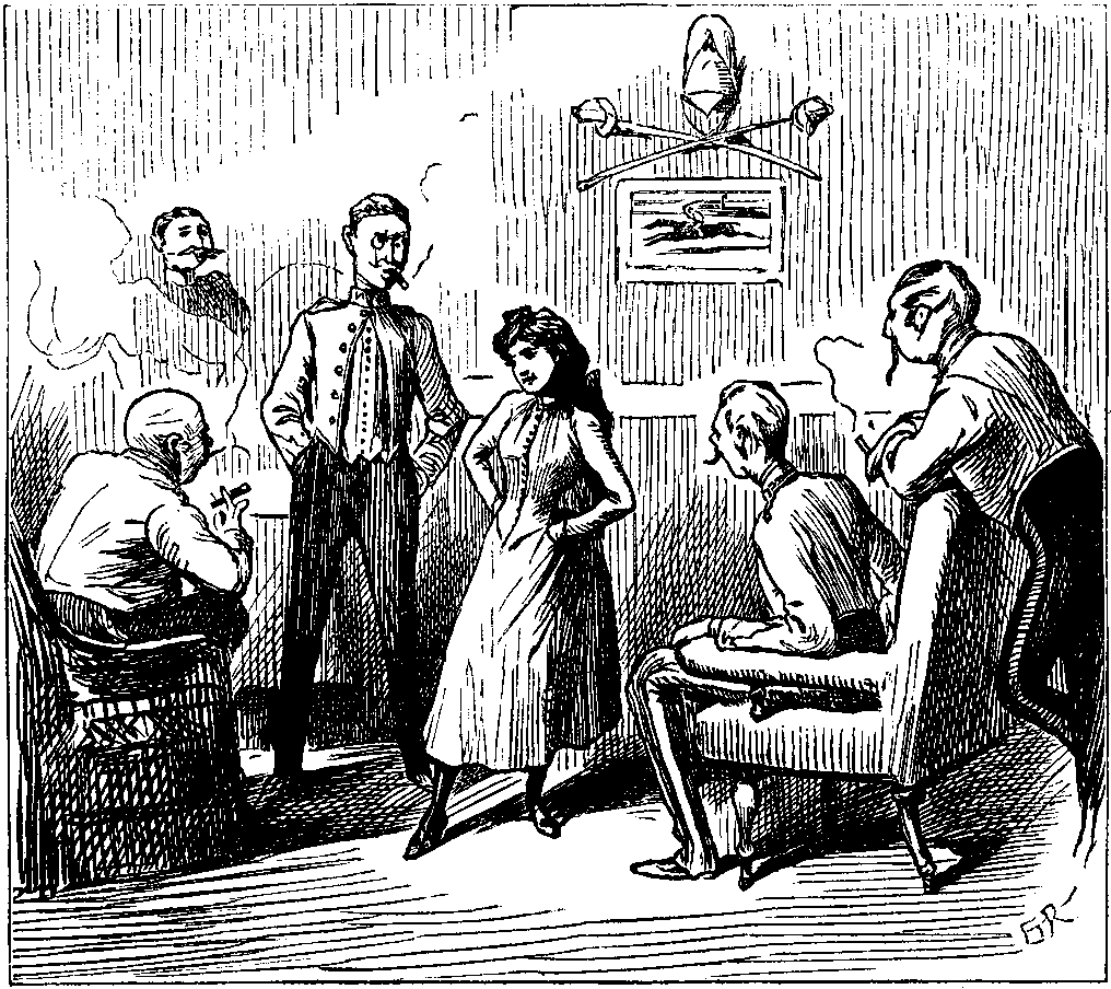In fact, whenever a Purple Dragoon fell in love, the object of his affections immediately pretended to love someone else. Hard lines, but soldiers were born to suffer. It is so easy, so true, so usual to say, "there's another day to-morrow," but that never helped even a Purple Dragoon to worry through to-day any the quicker. Poor, brave, noble, drawling, manly, pipe-smoking fellows! On this particular occasion FOOTLES uttered only one word. It was short, and began with the fourth letter of the alphabet. But he may be pardoned, for some of the glowing embers from his magnificent briar-wood pipe had dropped on to his regulation overalls. The result was painful—to FOOTLES. All the others laughed as well as they could, with clays, meerschaums, briars, and asbestos pipes in their mouths. And through the thick cloud of scented smoke the mess-waiter came into the room, bearing in his hand a large registered letter, and coughing violently.