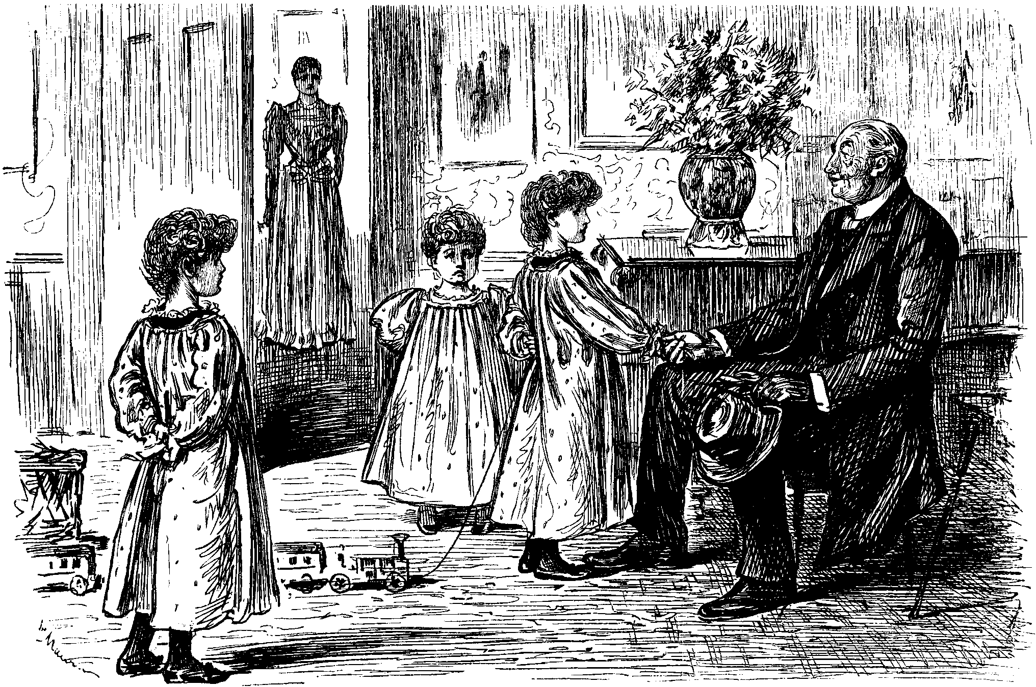 "You're FOOTLES," she said, skipping up to the thunder-stricken owner of the name. "I know you very well. I'm going to be your daughter, and you're going to marry my mother. Oh, it's all right," she continued, as she observed FOOTLES press his right hand convulsively to the precise spot on his gorgeous mess-waistcoat under which he imagined his heart to be situated, "it's all right. Pa's going to be comfortably killed, and put out of the way, and then you'll marry darling Mamma. She'll be a thousand times more beautiful at thirty-three than she was at twenty-two, and ever so much more lovely at fifty-five than at thirty-three. So it's a good bargain, isn't it, EM?" This to EMILY, who appeared confused. She trotted up to him, and laid her soft blooming cheek against his blooming hard one. "Never mind, EM," she lisped, "everything is bound to come out right. I've settled it all"—this with a triumphant look on her baby-face—"with the author; such a splendid writer, none of your twaddling women-scribblers, but a real man, and a great friend of mine. I'm to marry you, EM. You don't know it, because you once loved NAOMI, who 'mawrwried the Wrevewrend SOLOMON'"—at this point most of the Purple Dragoons were rude enough to yawn openly. She paid no attention to them—"and now you love OLIVE, but she loves PARKACK, and he doesn't love her, so she has got to marry PARKOSS, whom she doesn't love. Their initials are the same, and everybody knows their caligraphy is exactly alike," she went on wearily, "so that's how the mistake arose. It's a bit far-fetched, but," and her arch smile as she said this would have melted a harder heart than Captain EMILY's, "we mustn't be too particular in a soldier's tale, you know."