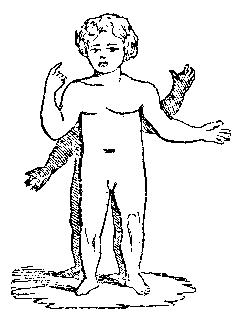 The learned Hippocrates affirms that the child, as he is placed in the womb, has his hands on his knees, and his head bent to his feet, so that he lies round together, his hands upon his knees and his face between them, so that each eye touches each thumb, and his nose betwixt his knees. And of the same opinion in this matter was Bartholinus. Columbus is of opinion that the figure of the child in the womb is round, the right arm bowed, the fingers under the ear, and about the neck, the head bowed so that the chin touches the breast, the left arm bowed above both breast and face and propped up by the bending of the right elbow; the legs are lifted upwards, the right so much that the thigh touches the belly, the knee the navel, the heel touches the left buttock, and the foot is turned back and covers the secrets; the left thigh touches the belly, and the leg lifted up to the breast.