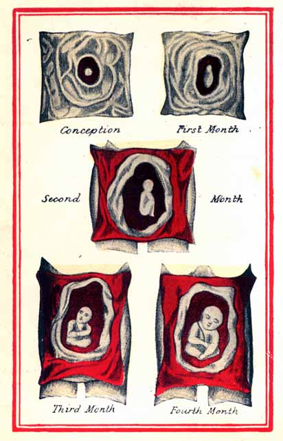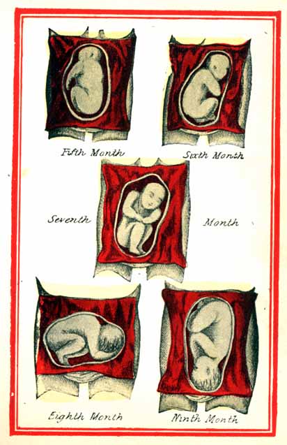 Most males are perfect by the thirtieth day, but females seldom before the forty-second or forty-fifth day, because the heat of the womb is greater in producing the male than the female. And, for the same reason, a woman going with a male child quickens in three months, but going with a female, rarely under four, at which time its hair and nails come forth, and the child begins to stir, kick and move in the womb, and then the woman is troubled with a loathing for meat and a greedy longing for things contrary to nutriment, as coals, rubbish, chalk, etc., which desire often occasions abortion and miscarriage. Some women have been so extravagant as to long for hob nails, leather, horse-flesh, man's flesh, and other unnatural as well as unwholesome food, for want of which thing they have either miscarried or the child has continued dead in the womb for many days, to the imminent hazard of their lives. But I shall now proceed to show by what means the child is maintained in the womb, and what posture it there remains in.