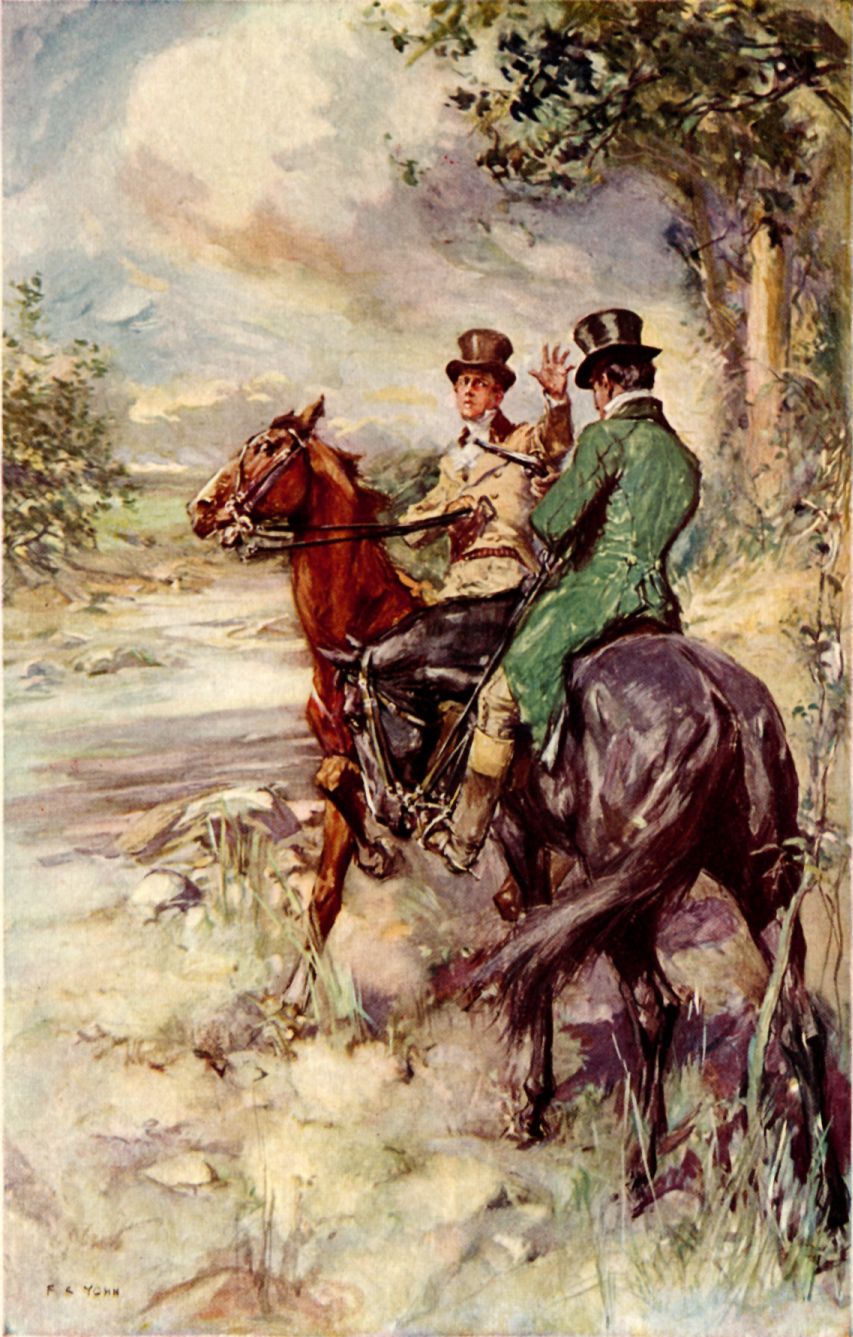 The boy dipped the pail, lifted it brimming, and rose from his knees. As he did so, a man parted the bushes on the far side of the stream, glanced at the mossed and slippery stones rising from its bed, then with a light and steady foot crossed to the boy's side. He was a young man, wearing a fringed hunting-shirt and leggins and a coonskin cap, and carrying a long musket. Over his shoulder was slung a wild turkey, and at his heels came a hound. He smiled, showing very white teeth, and drew forward his bronze trophy.