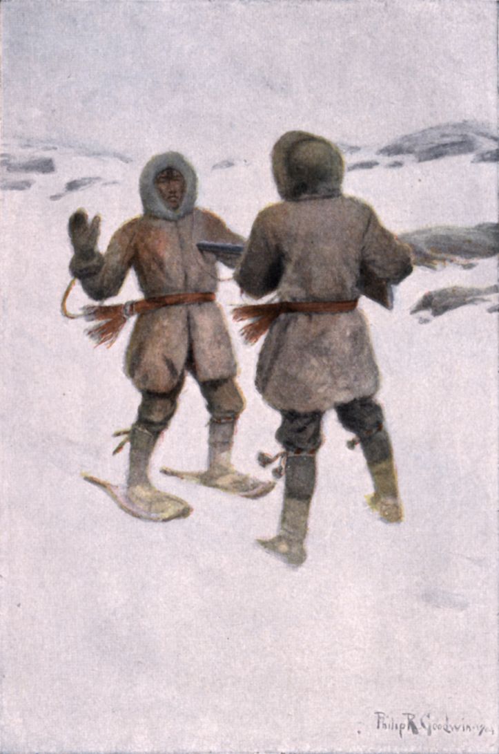 His companion was hardly more than a boy in years, though more than a man in physical development. In every respect he seemed to be especially adapted to the rigours of northern life. The broad arch of his chest, the plump smoothness of his muscles, above all, the full roundness of his throat indicated that warmth-giving blood, and plenty of it, would be pumped generously to every part of his body. His face from any point of view but one revealed a handsome, jaunty boy, whose beard was still a shade. But when he looked at one directly, the immaturity fell away. This might have been because of a certain confidence of experience beyond what most boys of twenty can know, or it might have been the result merely of a physical peculiarity. For his eyes were so extraordinarily close together that they seemed by their very proximity to pinch the bridge of his nose, and in addition, they possessed a queer slant or cast which twinkled perpetually now in one, now in the other. It invested him at once with an air singularly remote and singularly determined. But at once when he looked away the old boyishness returned, enhanced further by a certain youthful barbarity in the details of his dress—a slanted heron's feather in his hat, a beaded knife-sheath, an excess of ornamentation on his garters and moccasins, and the like.