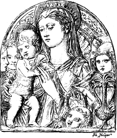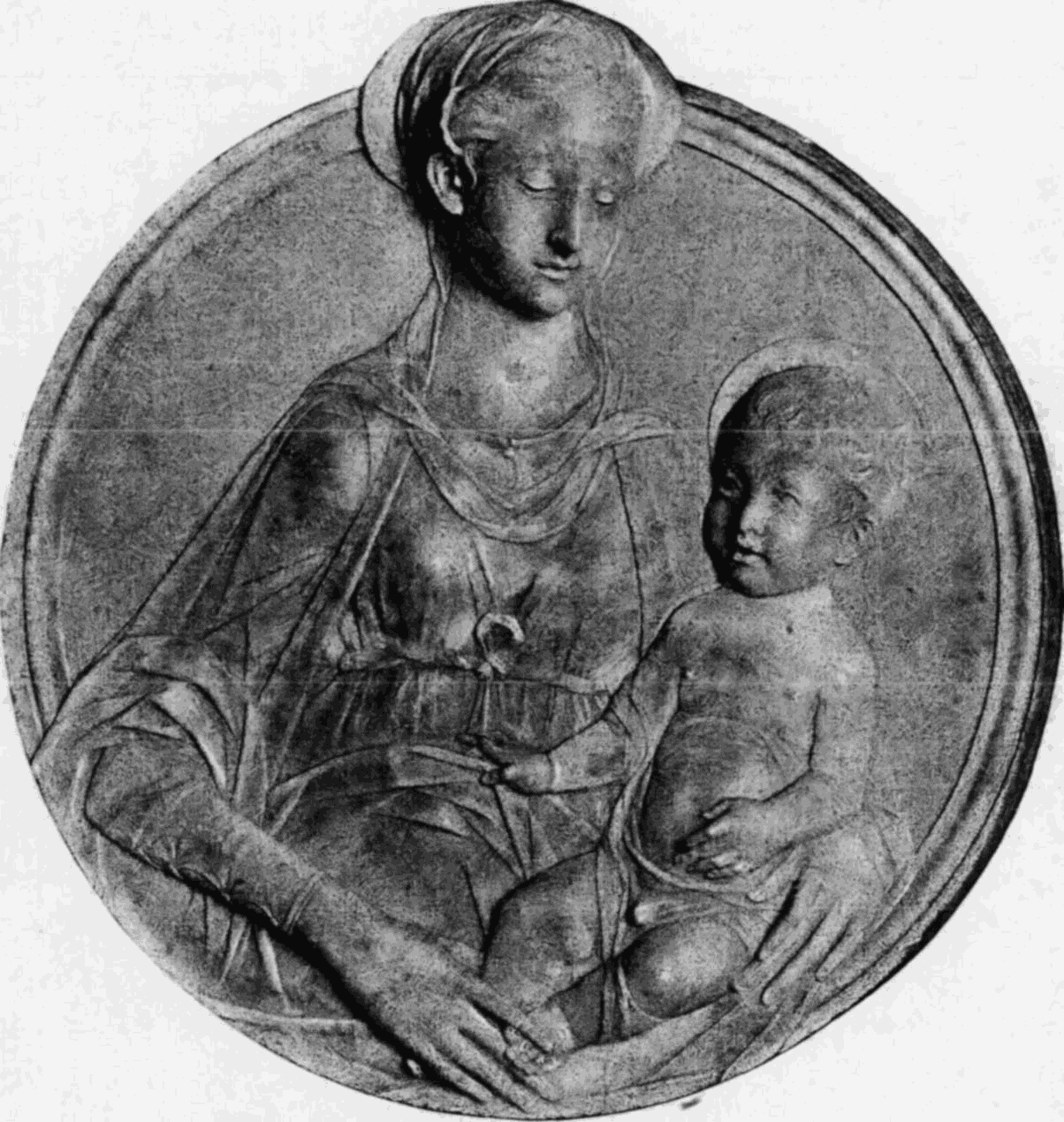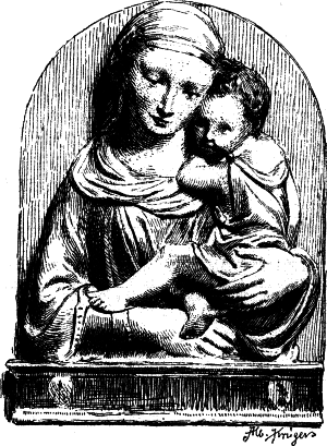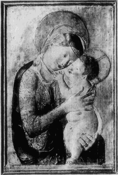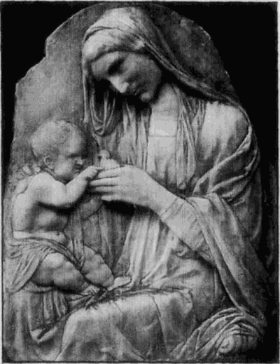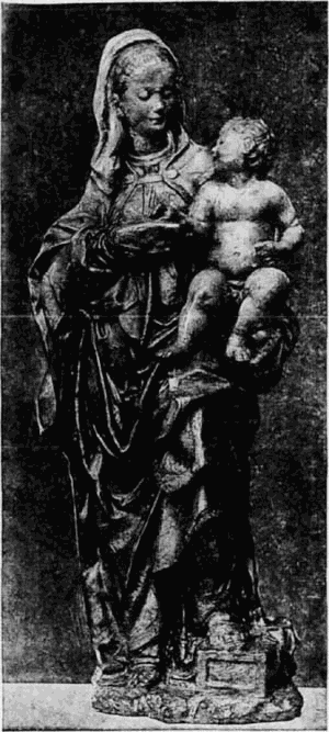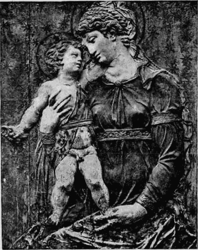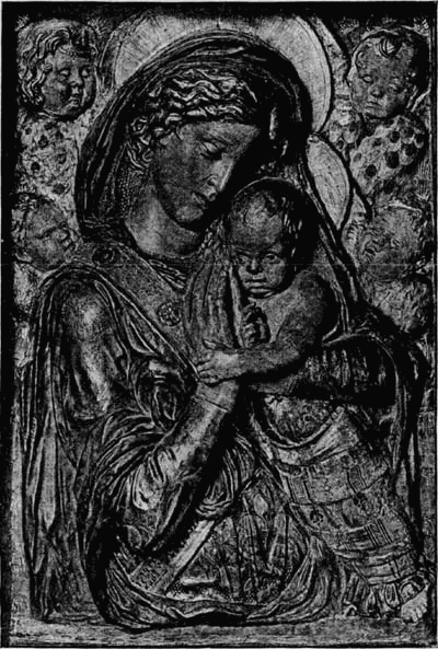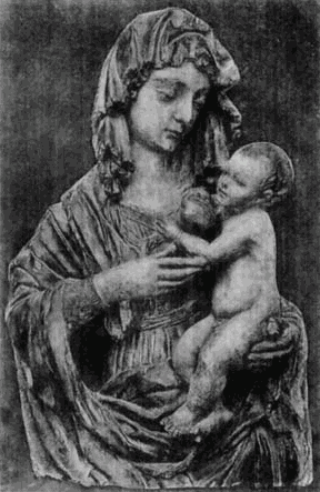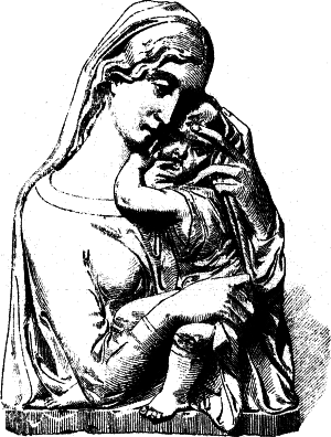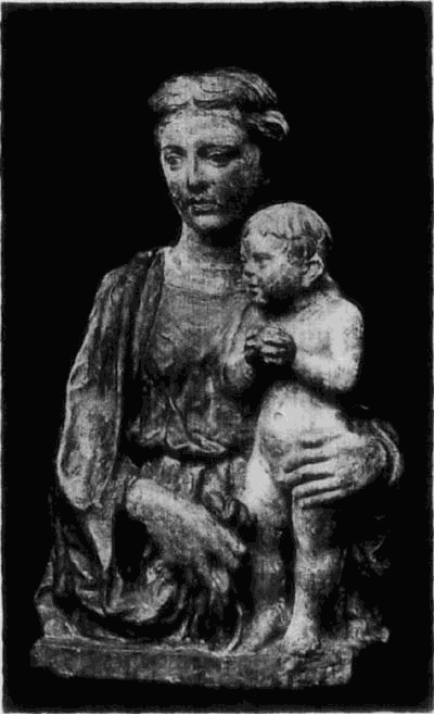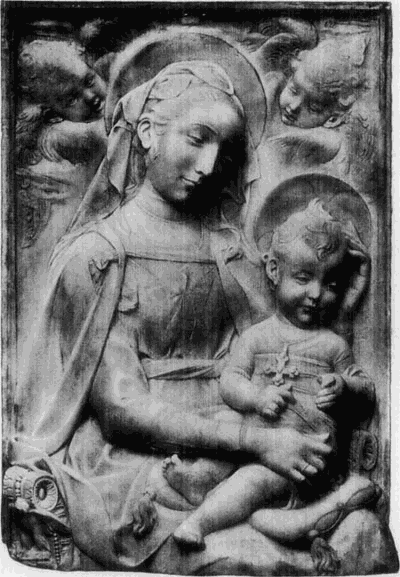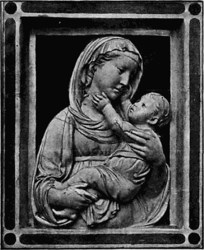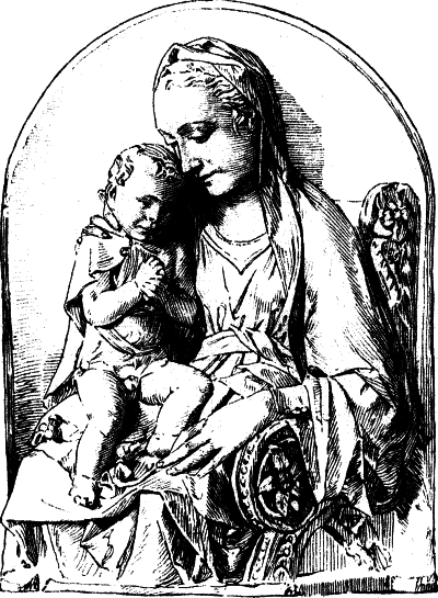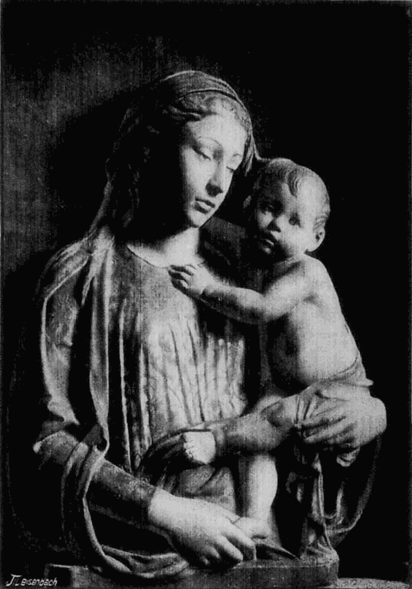 Die Richtung dieses Meisters hat mit der des Quercia in Siena manche Verwandtschaft, weshalb dieser auch gewöhnlich als der Urheber der hier in Frage kommenden Thonwerke gilt. Aber neben dem Meister der Pellegrinikapelle sehen wir noch verschiedene florentiner Bildner dieselbe Richtung verfolgen, und zwar meist freier und naturalistischer. Von eigenartiger Größe in der Erfindung erscheint ein Künstler, dem die Maria mit dem schlafenden Kinde (No. 112B) angehört. Ähnlich groß empfunden ist die Maria, welche das nackte, vor ihr stehende [54]Kind kitzelt (No. 112A). Einem anderen Meister gehören ein Paar große Madonnenkompositionen, denen besonders zarte Empfindung und reiche Gewandung eigentümlich ist (No. 109C und D). Besonders häufig als Stuckreliefs verbreitet sind verschiedene unter sich nahe verwandte Madonnen, in denen sich das Kind zärtlich an die Mutter anschmiegt; alle, wie das nebenstehend abgebildete Relief (No. 109), ausgezeichnet durch die glückliche Gruppierung von Mutter und Kind, das innige, rein menschliche Verhältnis zwischen beiden und die einfache, volle Faltengebung; nur in der Ausführung der Extremitäten, namentlich der Hände, verrät sich noch ein naturalistisch nicht zu voller Freiheit durchgebildeter Künstler.