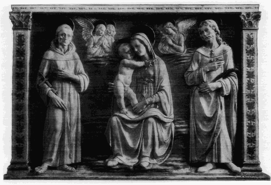 Alle diese Thonbildwerke wurden regelmäßig bemalt; selbst die meisten Modelle und Skizzen, da dieselben wegen ihres künstlerischen Wertes in den Ateliers aufbewahrt oder an andere Künstler vergeben wurden, die Naturfarbe des gebrannten Thons aber dem Farbensinn der Zeit widerstrebte. Ausgeführt wurde die Bemalung in Wasserfarben, und zwar ganz naturalistisch, wie bei einem Gemälde. Die Farben wurden meist nicht direkt auf den Thon aufgetragen, sondern man überzog denselben vorher, wie die Tafel bei Gemälden, mit einer dünnen Kreideschicht, weil auf dieser Farben und Vergoldung besser haften. Da manche dieser Bildwerke, wie Straßentabernakel, Lünetten, Friese u. a., zur Aufstellung in freier Luft bestimmt waren, so gab man den Farben zum Widerstande gegen die Witterung einen Lacküberzug, wie er z. B. noch bei dem Madonnenrelief (No. 112A) erhalten ist. Ein solcher Überzug konnte jedoch nur kurze Zeit dem Einflüsse von Wasser und Sonne widerstehen; daher kam Luca della Robbia auf den Gedanken, seine Thonskulpturen in derselben Art wie die Thongefäße mit einer Glasur zu überziehen. Seine Versuche hatten den besten Erfolg und fanden allgemeinsten Beifall, so daß sich eine Industrie daran anknüpfte, welche ein Jahrhundert lang in der Familie dieses Künstlers durch verschiedene Generationen ausgeübt wurde. Florenz und der von Florenz abhängige Teil Mittelitaliens verdankt derselben eine außerordentlich große Zahl von Altären, Tabernakeln, Lünetten, Wappen, Friesen, ausnahmsweise auch Freifiguren, Taufbecken u. s. f., die meist noch an Ort und Stelle erhalten sind. Das Thonmodell wurde leicht gebrannt (bei größeren Monumenten in mehreren Stücken), dann bemalt und nach Überzug mit einer Emailschicht zum zweiten Mal ins Feuer gebracht. Die Bemalung war (und zwar von vornherein schon bei Luca selbst) entweder ganz farbig; [44]dann waren die Farben auf weiß, blau, grün, gelb, violett und schwarz beschränkt; oder die Figuren wurden, in Nachahmung des Marmors, weiß gelassen; dann erhielt nur der Hintergrund bei Reliefs einen blauen Ton und die Ornamente, Heiligenscheine und Muster wurden vielfach vergoldet. Die Einrahmung besteht meist aus plastischen, farbig gehaltenen Frucht- oder Blumenkränzen von stilvoller Anordnung, aber feinster naturalistischer Durchführung.