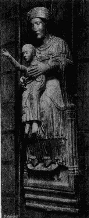 Für den Einfluß französischer Gotik, der sich in diesen Monumenten Süditaliens unter der Herrschaft der Anjou gelegentlich geltend macht, sind ein Paar Marmorstatuetten der Berliner Sammlung, die aus Neapel stammen (No. 29 und 30), charakteristische Beispiele. Von ungewöhnlich feiner Empfindung, erscheinen sie den Leidtragenden an gleichzeitigen französischen und burgundischen Sarkophagen in Ausdruck, Haltung und selbst in der Tracht nahe verwandt. Wie lange sich hier im Süden, namentlich in Sicilien und Calabrien, diese Mischung französischer und Pisaner Gotik erhält, dafür ist die reich bemalte Alabasterfigur der Madonna (No. 206) ein charakteristisches Beispiel; sie kann nach den Ornamenten wie nach der Behandlung kaum vor 1500 entstanden sein.
