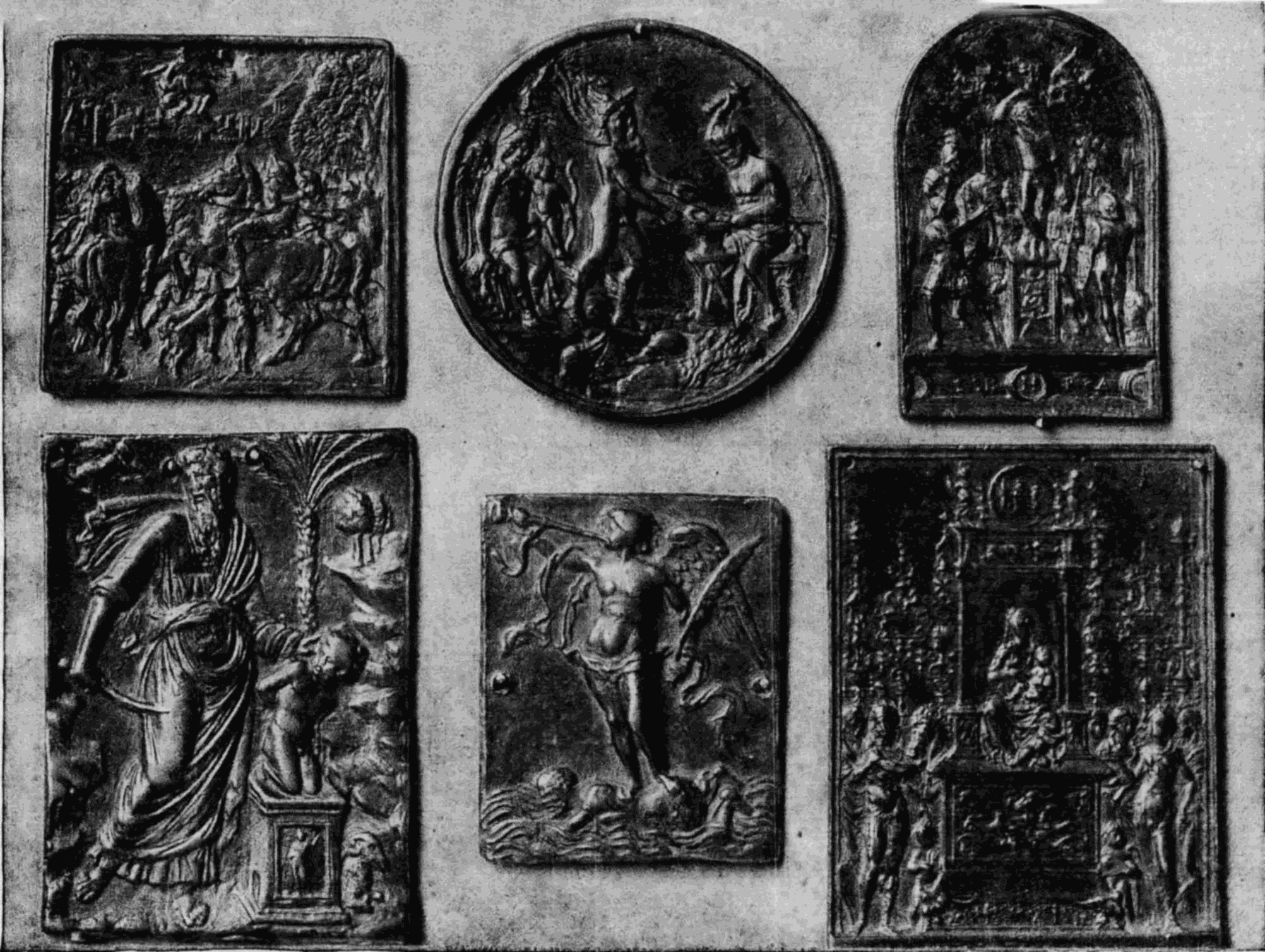 Wie im Trecento, so spielt auch im Quattrocento die Goldschmiedekunst eine wichtige Rolle in der Plastik; war doch eine Reihe der tüchtigsten Bildhauer dieser Zeit bei Goldschmieden ausgebildet oder selbst als Goldschmiede hervorragend thätig. Neben gelegentlichen Aufträgen der Kirchen auf Vervollständigung jener großen Silberaltäre mit kleinen getriebenen Reliefs und Einzelfiguren, wie sie in Florenz und Pistoja noch erhalten sind, hatten die Goldschmiede namentlich die wachsenden Ansprüche der Vornehmen an eine künstlerische Gestaltung des Schmuckes und der kleinen häuslichen Geräte zu befriedigen. Kußtäfelchen für die Andacht im Hause, Schmuckkästchen aller Art, Tintefässer, Leuchter und Lampen, Hut-Agraffen, Schwertknäufe, Schließen u. dergl. wurden in Gold, Silber oder edlen Steinarten, namentlich in Bergkrystall hergestellt und bei dem monumentalen Sinne der Zeit in reichster Weise plastisch ausgestattet. Wie nun das künstlerische Bedürfnis der Zeit in den bemalten Stuckbildwerken ein Mittel zu weitester Verbreitung hervorragender größerer Bildwerke gefunden hatte, so wußten die Künstler diesem Bedürfnisse in ähnlicher Weise für jene kleinen Gebrauchsgegenstände entgegenzukommen, indem sie die kostbaren Originale oder die Modelle derselben abformten und in Bronze (ausnahmsweise auch in Blei[A]) nachgössen; die einzelnen Teile aber waren gesuchte Besitzstücke in den Werkstätten der Bildhauer und Goldschmiede des XV. und XVI. Jahrh. Diese Nachgüsse erhalten dadurch für die Skulptur eine ähnliche Bedeutung wie der Kupferstich für die zeichnenden Künste. Während die Originale, ihres edlen Materials halber bis auf eine kleine Zahl durch Einschmelzen zerstört wurden, sind uns Bronzenachbildungen davon in ganzen oder nur in einzelnen Teilen, namentlich in den kleinen Relieftafeln, den Plaketten (plachette, plaquettes, vergl. S. 39f.), zahlreich erhalten. Die verschiedenartigen, bis jetzt bekannten Plaketten aus dem Quattrocento und den ersten Jahrzehnten des Cinquecento übersteigen die Ziffer von eintausend; die Berliner Sammlung besitzt davon allein nahezu achthundert, die fast ausnahmslos erst in neuester [46]Zeit erworben wurden, während Goethe schon im Anfange dieses Jahrhunderts mit den italienischen Medaillen auch eine nicht unbedeutende Sammlung solcher Plaketten zusammenbrachte (jetzt im Goethe-Museum zu Weimar). Der Wert dieser kleinen Bronzereliefs besteht namentlich in der Veranschaulichung der Meisterschaft, welche die Plastik des Quattrocento in der Erfindung und in der Ausgestaltung der mannigfaltigsten Motive, wie in der stilvollen Durchführung der verschiedensten Arten des Reliefs besaß; auch können wir, da die große Plastik fast ganz auf religiöse Motive oder Porträtdarstellung beschränkt blieb, hier allein das Geschick der Künstler in der plastischen Gestaltung mythologischer, historischer und allegorischer Gegenstände genügend kennen lernen.