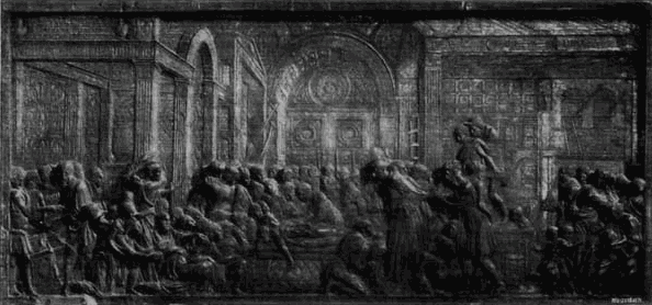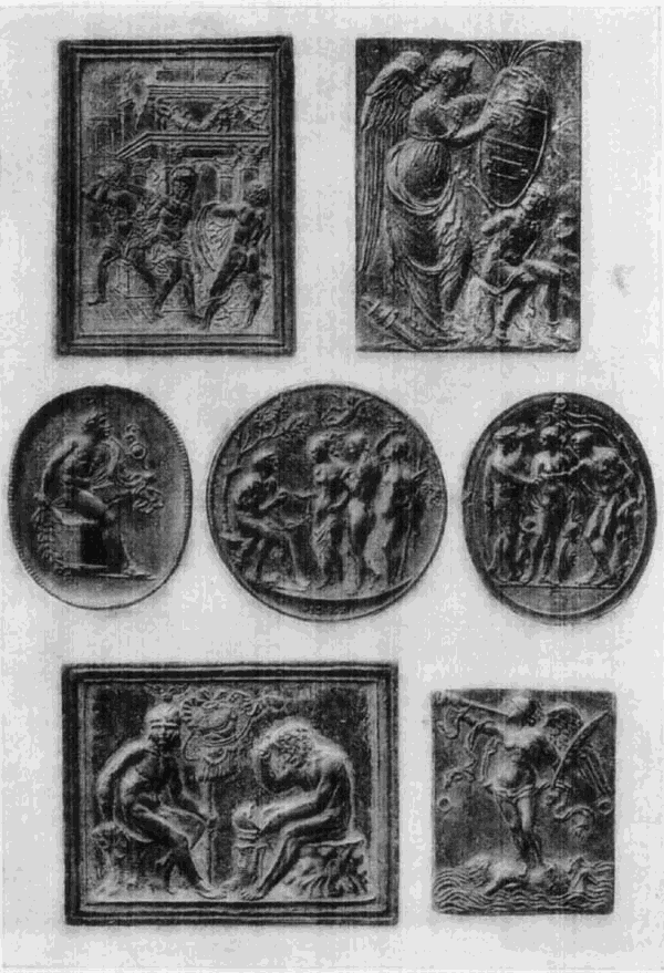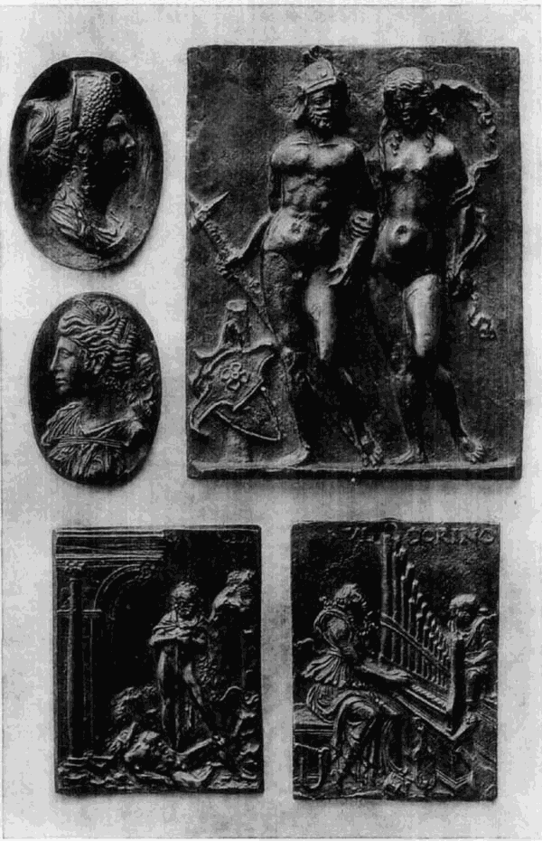 Die Verehrung der Antike und das Studium derselben weckte auch in den Bildhauern das Interesse an den Stoffen aus der antiken Mythologie und Geschichte. Da die große Kunst fast ausschließlich auf kirchliche Aufgaben beschränkt blieb, so war es die für die Privaten beschäftigte Kleinkunst, in welcher die Freude an solchen Stoffen volle Bethätigung finden konnte; in der Plastik insbesondere der bildnerische Schmuck der kleinen Hausgeräte, wie Tintefässer, Leuchter, Schwertgriffe, Agraffen, Kästchen u. s. f., die uns heute meist nur in ihren einzelnen Teilen, den sogenannten Plaketten, erhalten sind, ferner die Rückseiten der Medaillen und die Kameen. Die Motive sind zumeist den bekanntesten römischen Klassikern, namentlich Ovid und Livius entlehnt und je nach der Bestimmung des Gegenstandes mit [40]feiner Beziehung ausgewählt: an den Schwertgriffen finden wir regelmäßig Thaten der mythischen römischen Helden, die Herkulesarbeiten oder ähnliche Darstellungen, an den Agraffen Venus und Amor, die Liebschaften der Götter u. dergl.
