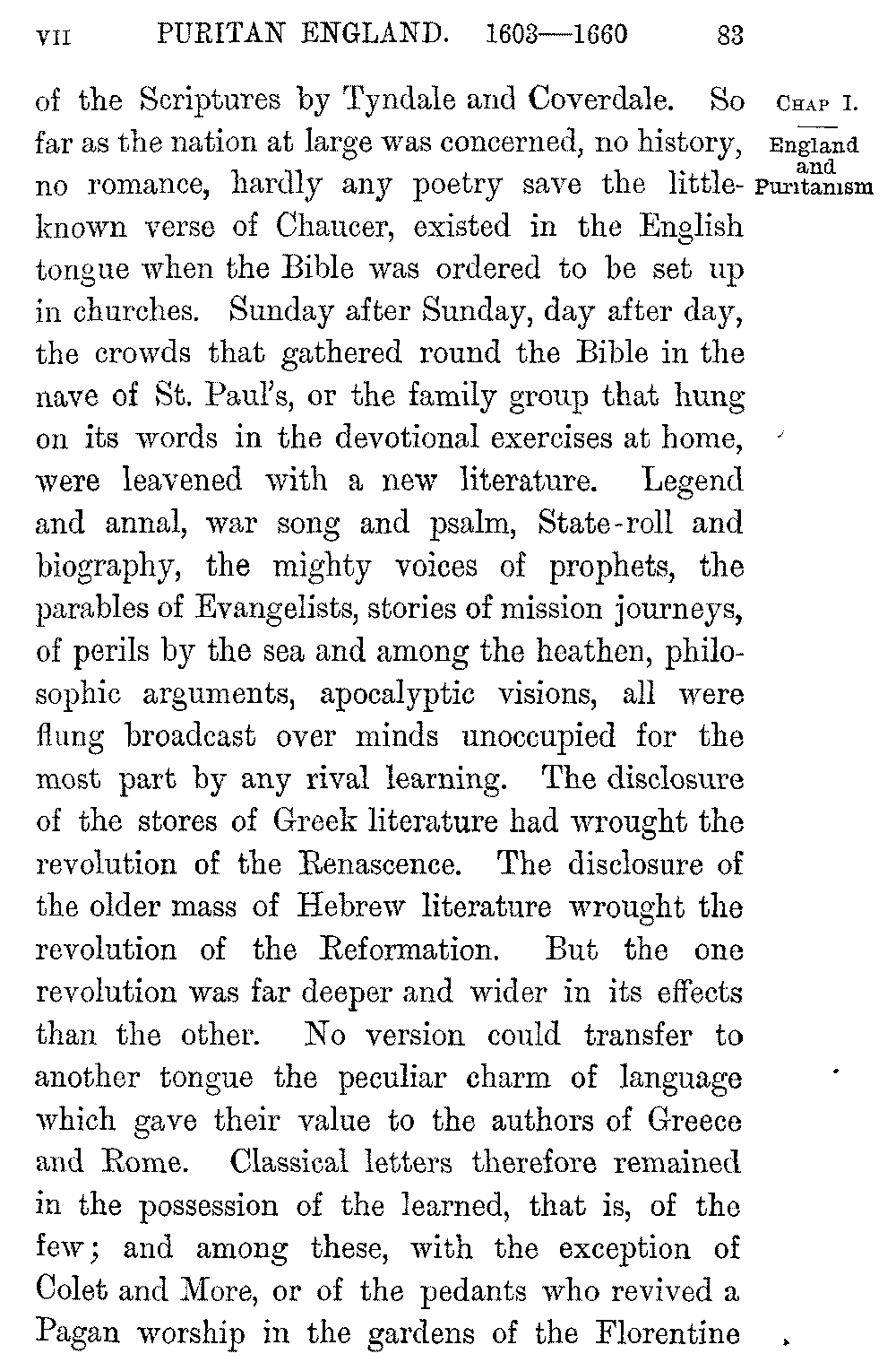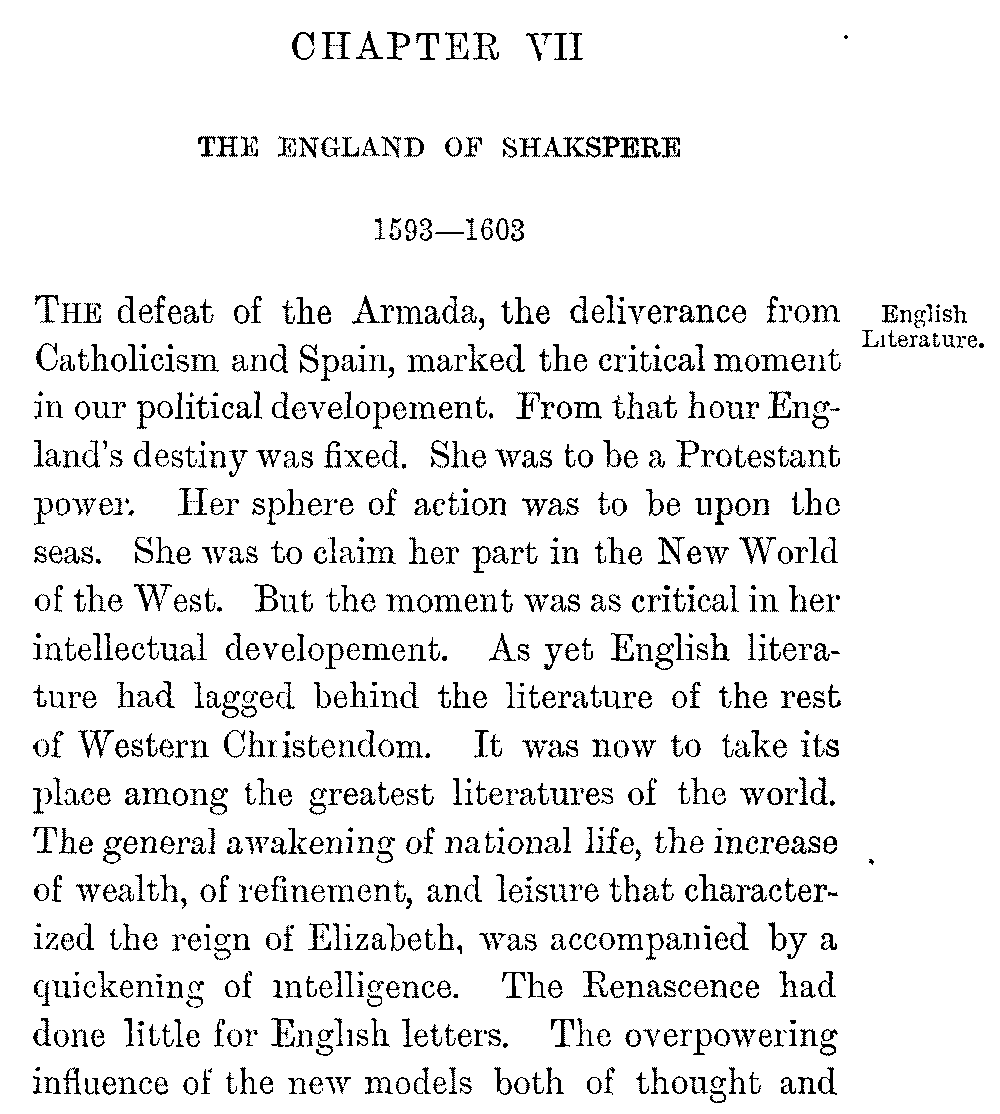 The defeat of the Armada, the deliverance from Catholicism and Spain, marked the critical moment in our political developement. From that hour England's destiny was fixed. She was to be a Protestant power. Her sphere of action was to be upon the seas. She was to claim her part in the New World of the West. But the moment was as critical in her intellectual developement. As yet English literature had lagged behind the literature of the rest of Western Christendom. It was now to take its place among the greatest literatures of the world. The general awakening of national life, the increase of wealth, of refinement, and leisure that characterized the reign of Elizabeth, was accompanied by a quickening of intelligence. The Renascence had done little for English letters. The overpowering influence of the new models both of thought and 5-002]style which it gave to the world in the writers of Greece and Rome was at first felt only as a fresh check to the revival of English poetry or prose. Though England shared more than any European country in the political and ecclesiastical results of the New Learning, its literary results were far less than in the rest of Europe, in Italy, or Germany, or France. More alone ranks among the great classical scholars of the sixteenth century. Classical learning indeed all but perished at the Universities in the storm of the Reformation, nor did it revive there till the close of Elizabeth's reign. Insensibly however the influences of the Renascence fertilized the intellectual soil of England for the rich harvest that was to come. The court poetry which clustered round Wyatt and Surrey, exotic and imitative as it was, promised a new life for English verse. The growth of grammar-schools realized the dream of Sir Thomas More, and brought the middle-classes, from the squire to the petty tradesman, into contact with the masters of Greece and Rome. The love of travel, which became so remarkable a characteristic of Elizabeth's age, quickened the temper of the wealthier nobles. "Home-keeping youths," says Shakspere in words that mark the time, "have ever homely wits"; and a tour over the Continent became part of the education of a gentleman. Fairfax's version of Tasso, Harrington's version of Ariosto, were signs of the influence which the literature of Italy, 5-003]the land to which travel led most frequently, exerted on English minds. The classical writers told upon England at large when they were popularized by a crowd of translations. Chapman's noble version of Homer stands high above its fellows, but all the greater poets and historians of the ancient world were turned into English before the close of the sixteenth century.