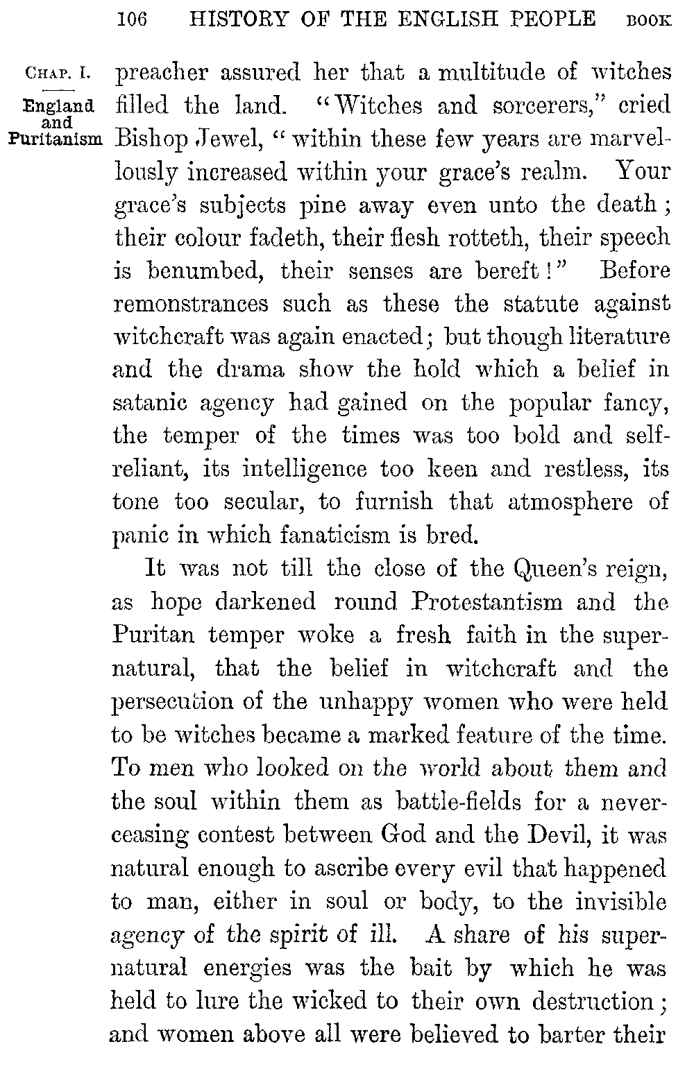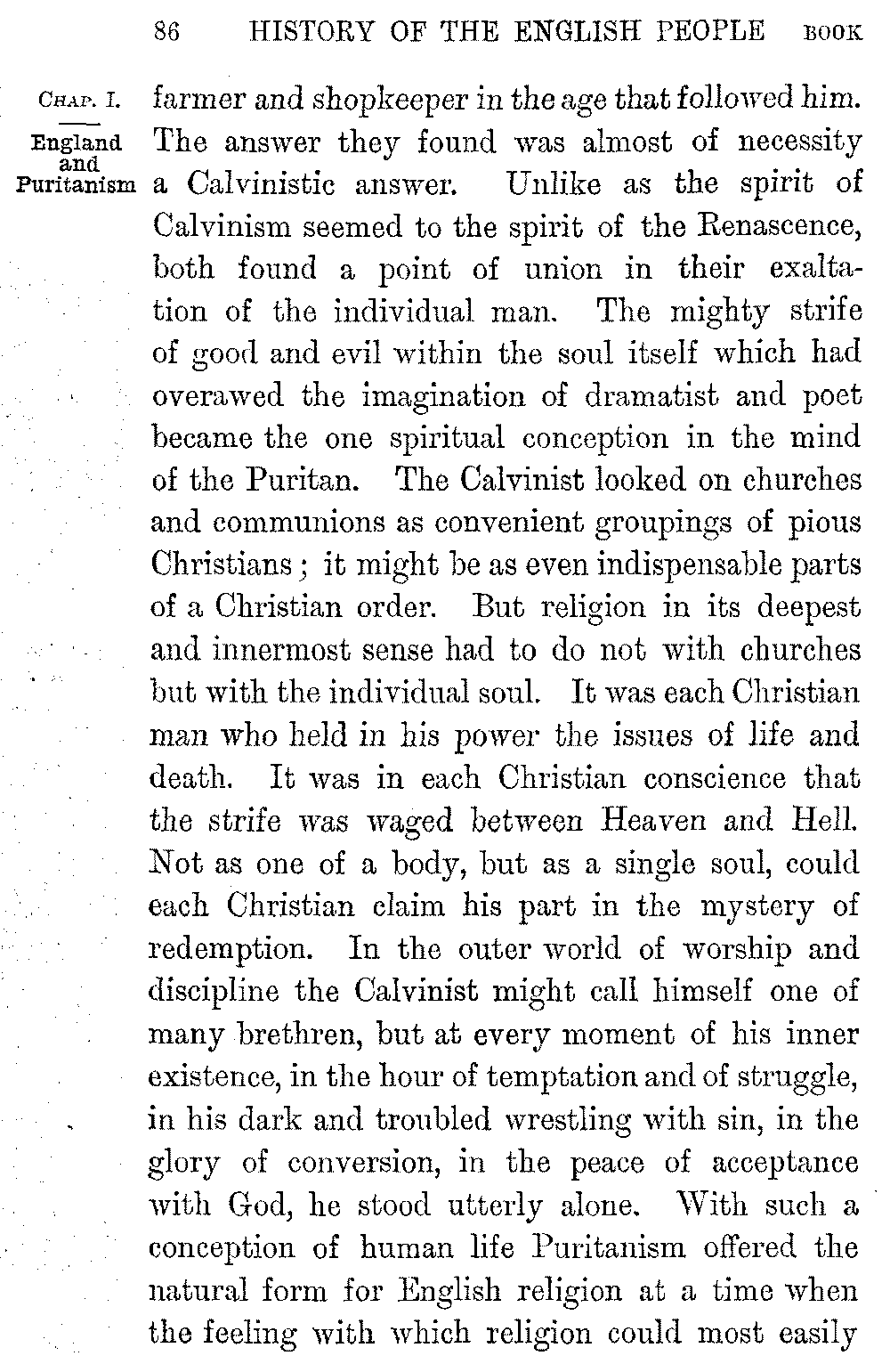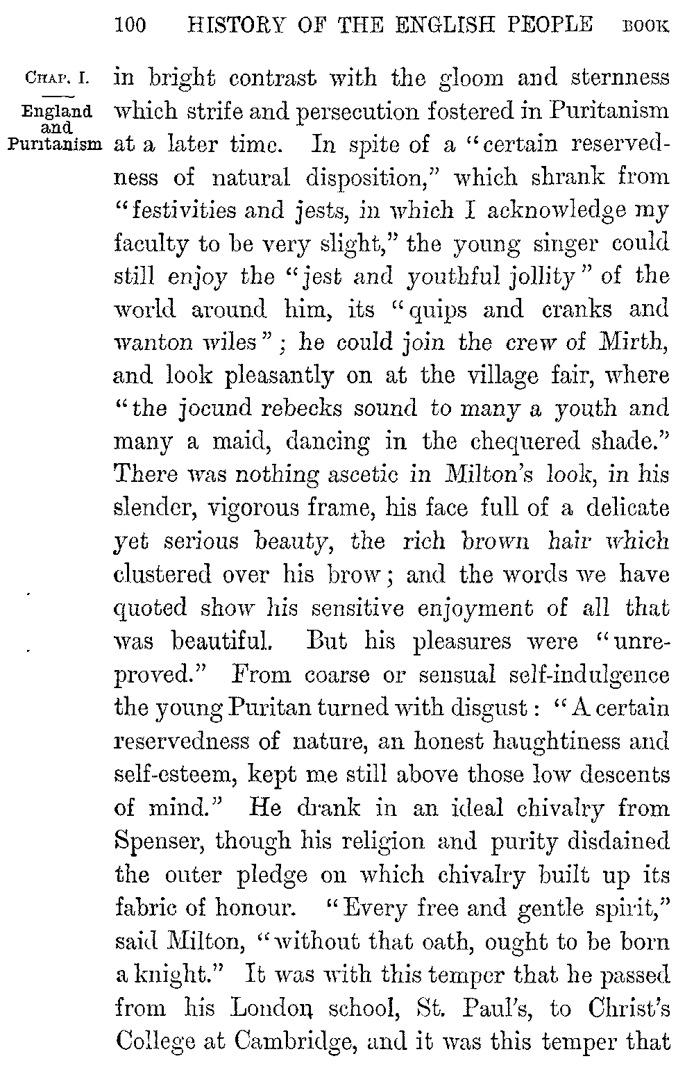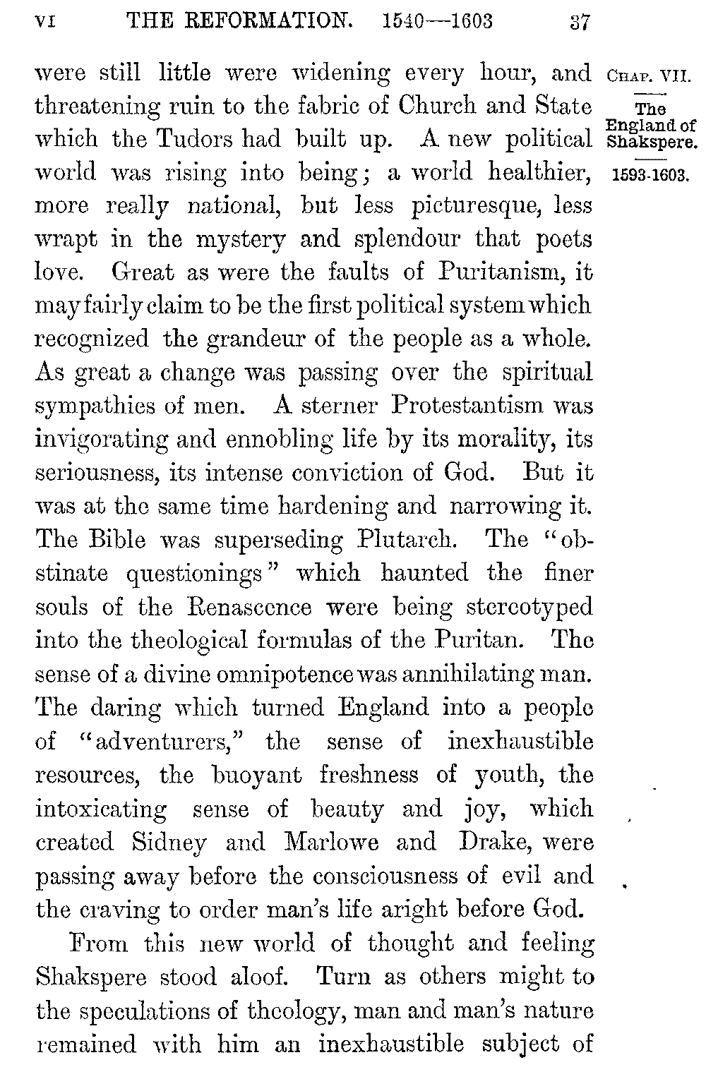 No dramas have done so much for Shakspere's enduring popularity with his countrymen as these historical plays. They have done more than all the works of English historians to nourish in the minds of Englishmen a love of and reverence for their country's past. When Chatham was asked where he had read his English history he answered, "In the plays of Shakspere." Nowhere could he have read it so well, for nowhere is the spirit of our history so nobly rendered. If the poet's work echoes sometimes our national prejudice and unfairness of temper, it is instinct throughout with English humour, with our English love of hard fighting, our English faith in goodness and in the doom that waits upon triumphant evil, our English pity for the fallen. Shakspere is Elizabethan to the core. He stood at the meeting-point of two great epochs of our history. The age of the Renascence was passing into the age of Puritanism. Rifts which 5-037]were still little were widening every hour, and threatening ruin to the fabric of Church and State which the Tudors had built up. A new political world was rising into being; a world healthier, more really national, but less picturesque, less wrapt in the mystery and splendour that poets love. Great as were the faults of Puritanism, it may fairly claim to be the first political system which recognized the grandeur of the people as a whole. As great a change was passing over the spiritual sympathies of men. A sterner Protestantism was invigorating and ennobling life by its morality, its seriousness, its intense conviction of God. But it was at the same time hardening and narrowing it. The Bible was superseding Plutarch. The "obstinate questionings" which haunted the finer souls of the Renascence were being stereotyped into the theological formulas of the Puritan. The sense of a divine omnipotence was annihilating man. The daring which turned England into a people of "adventurers," the sense of inexhaustible resources, the buoyant freshness of youth, the intoxicating sense of beauty and joy, which created Sidney and Marlowe and Drake, were passing away before the consciousness of evil and the craving to order man's life aright before God.