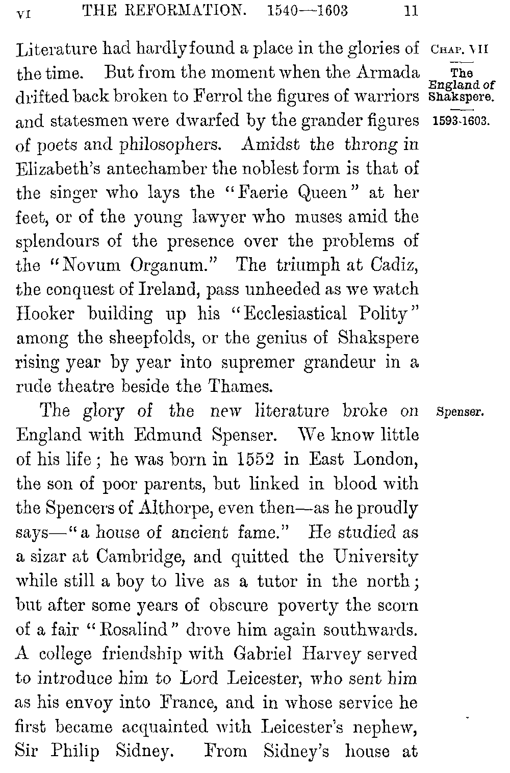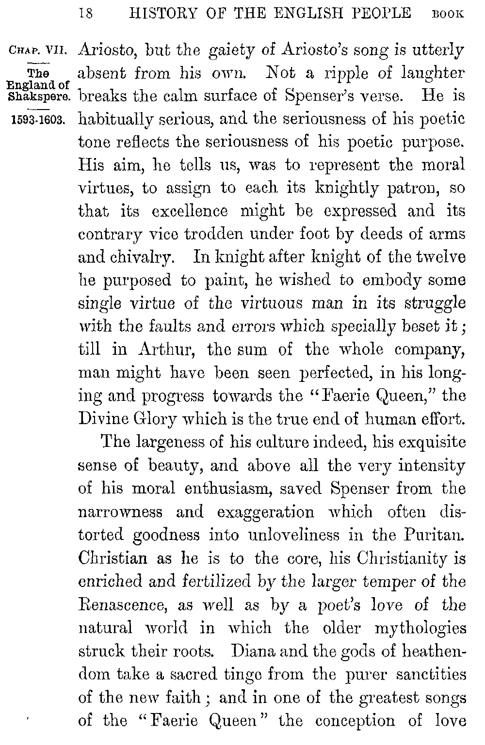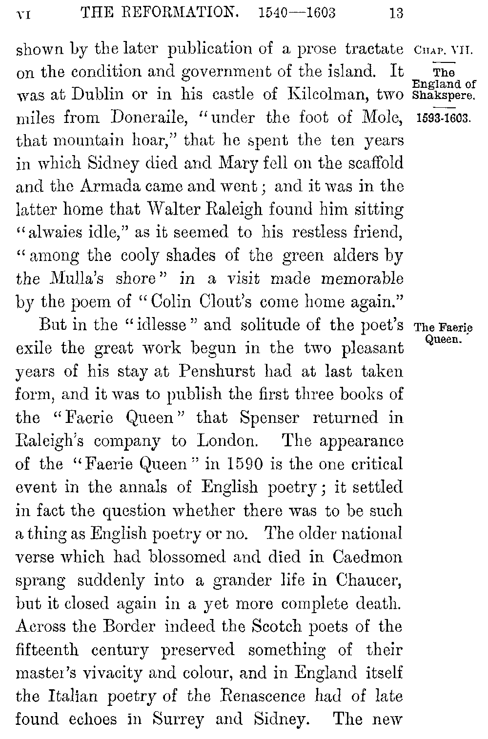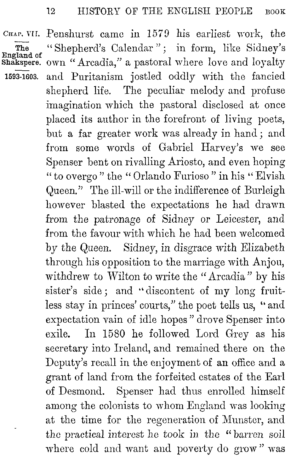 The glory of the new literature broke on England with Edmund Spenser. We know little of his life; he was born in 1552 in East London, the son of poor parents, but linked in blood with the Spencers of Althorpe, even then—as he proudly says—"a house of ancient fame." He studied as a sizar at Cambridge, and quitted the University while still a boy to live as a tutor in the north; but after some years of obscure poverty the scorn of a fair "Rosalind" drove him again southwards. A college friendship with Gabriel Harvey served to introduce him to Lord Leicester, who sent him as his envoy into France, and in whose service he first became acquainted with Leicester's nephew, Sir Philip Sidney. From Sidney's house at 5-012]Penshurst came in 1579 his earliest work, the "Shepherd's Calendar"; in form, like Sidney's own "Arcadia," a pastoral where love and loyalty and Puritanism jostled oddly with the fancied shepherd life. The peculiar melody and profuse imagination which the pastoral disclosed at once placed its author in the forefront of living poets, but a far greater work was already in hand; and from some words of Gabriel Harvey's we see Spenser bent on rivalling Ariosto, and even hoping "to overgo" the "Orlando Furioso" in his "Elvish Queen." The ill-will or the indifference of Burleigh however blasted the expectations he had drawn from the patronage of Sidney or Leicester, and from the favour with which he had been welcomed by the Queen. Sidney, in disgrace with Elizabeth through his opposition to the marriage with Anjou, withdrew to Wilton to write the "Arcadia" by his sister's side; and "discontent of my long fruitless stay in princes' courts," the poet tells us, "and expectation vain of idle hopes" drove Spenser into exile. In 1580 he followed Lord Grey as his secretary into Ireland, and remained there on the Deputy's recall in the enjoyment of an office and a grant of land from the forfeited estates of the Earl of Desmond. Spenser had thus enrolled himself among the colonists to whom England was looking at the time for the regeneration of Munster, and the practical interest he took in the "barren soil where cold and want and poverty do grow" was 5-013]shown by the later publication of a prose tractate on the condition and government of the island. It was at Dublin or in his castle of Kilcolman, two miles from Doneraile, "under the foot of Mole, that mountain hoar," that he spent the ten years in which Sidney died and Mary fell on the scaffold and the Armada came and went; and it was in the latter home that Walter Raleigh found him sitting "alwaies idle," as it seemed to his restless friend, "among the cooly shades of the green alders by the Mulla's shore" in a visit made memorable by the poem of "Colin Clout's come home again."