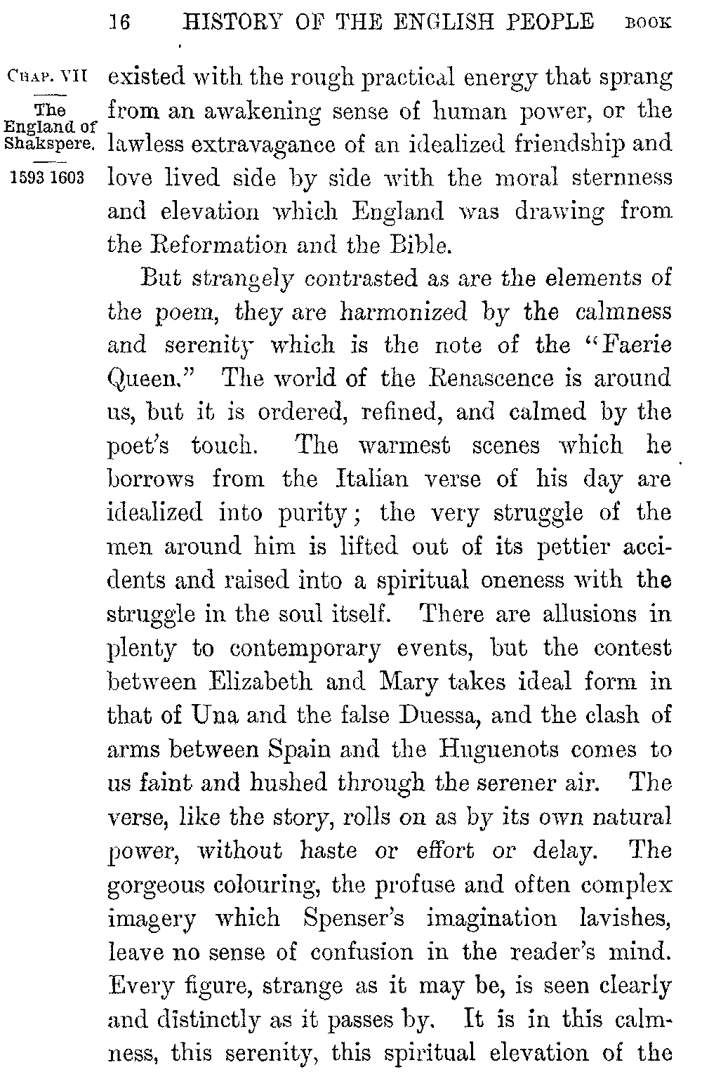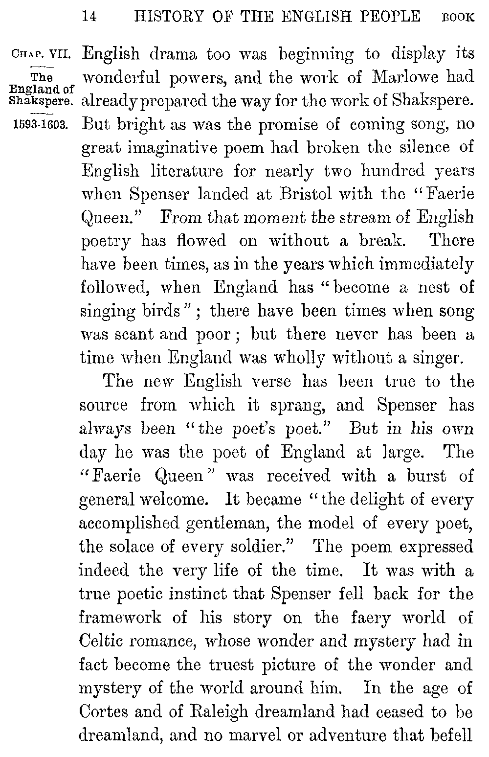 But in the "idlesse" and solitude of the poet's exile the great work begun in the two pleasant years of his stay at Penshurst had at last taken form, and it was to publish the first three books of the "Faerie Queen" that Spenser returned in Raleigh's company to London. The appearance of the "Faerie Queen" in 1590 is the one critical event in the annals of English poetry; it settled in fact the question whether there was to be such a thing as English poetry or no. The older national verse which had blossomed and died in Caedmon sprang suddenly into a grander life in Chaucer, but it closed again in a yet more complete death. Across the Border indeed the Scotch poets of the fifteenth century preserved something of their master's vivacity and colour, and in England itself the Italian poetry of the Renascence had of late found echoes in Surrey and Sidney. The new 5-014]English drama too was beginning to display its wonderful powers, and the work of Marlowe had already prepared the way for the work of Shakspere. But bright as was the promise of coming song, no great imaginative poem had broken the silence of English literature for nearly two hundred years when Spenser landed at Bristol with the "Faerie Queen." From that moment the stream of English poetry has flowed on without a break. There have been times, as in the years which immediately followed, when England has "become a nest of singing birds"; there have been times when song was scant and poor; but there never has been a time when England was wholly without a singer.