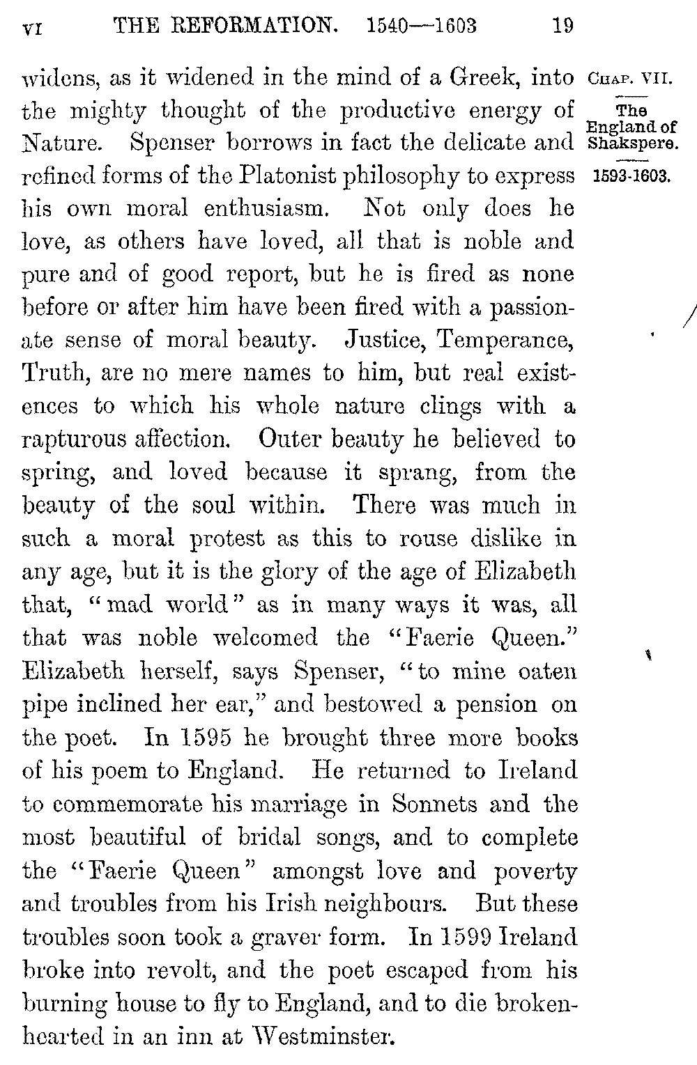 The largeness of his culture indeed, his exquisite sense of beauty, and above all the very intensity of his moral enthusiasm, saved Spenser from the narrowness and exaggeration which often distorted goodness into unloveliness in the Puritan. Christian as he is to the core, his Christianity is enriched and fertilized by the larger temper of the Renascence, as well as by a poet's love of the natural world in which the older mythologies struck their roots. Diana and the gods of heathendom take a sacred tinge from the purer sanctities of the new faith; and in one of the greatest songs of the "Faerie Queen" the conception of love 5-019]widens, as it widened in the mind of a Greek, into the mighty thought of the productive energy of Nature. Spenser borrows in fact the delicate and refined forms of the Platonist philosophy to express his own moral enthusiasm. Not only does he love, as others have loved, all that is noble and pure and of good report, but he is fired as none before or after him have been fired with a passionate sense of moral beauty. Justice, Temperance, Truth, are no mere names to him, but real existences to which his whole nature clings with a rapturous affection. Outer beauty he believed to spring, and loved because it sprang, from the beauty of the soul within. There was much in such a moral protest as this to rouse dislike in any age, but it is the glory of the age of Elizabeth that, "mad world" as in many ways it was, all that was noble welcomed the "Faerie Queen." Elizabeth herself, says Spenser, "to mine oaten pipe inclined her ear," and bestowed a pension on the poet. In 1595 he brought three more books of his poem to England. He returned to Ireland to commemorate his marriage in Sonnets and the most beautiful of bridal songs, and to complete the "Faerie Queen" amongst love and poverty and troubles from his Irish neighbours. But these troubles soon took a graver form. In 1599 Ireland broke into revolt, and the poet escaped from his burning house to fly to England, and to die broken-hearted in an inn at Westminster.