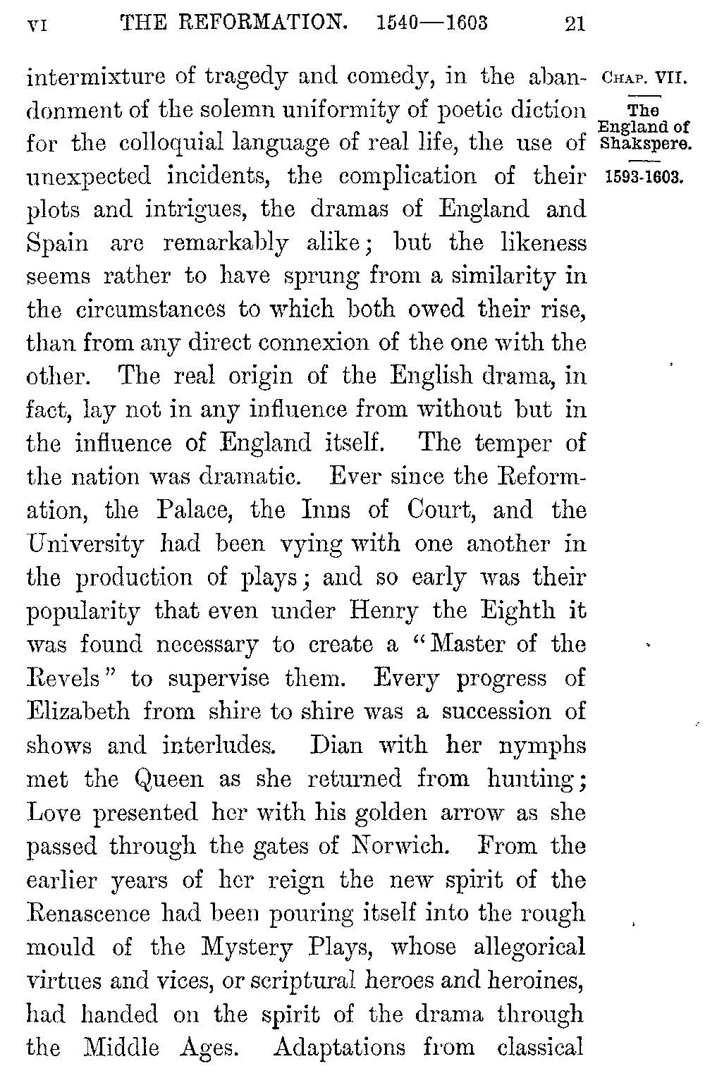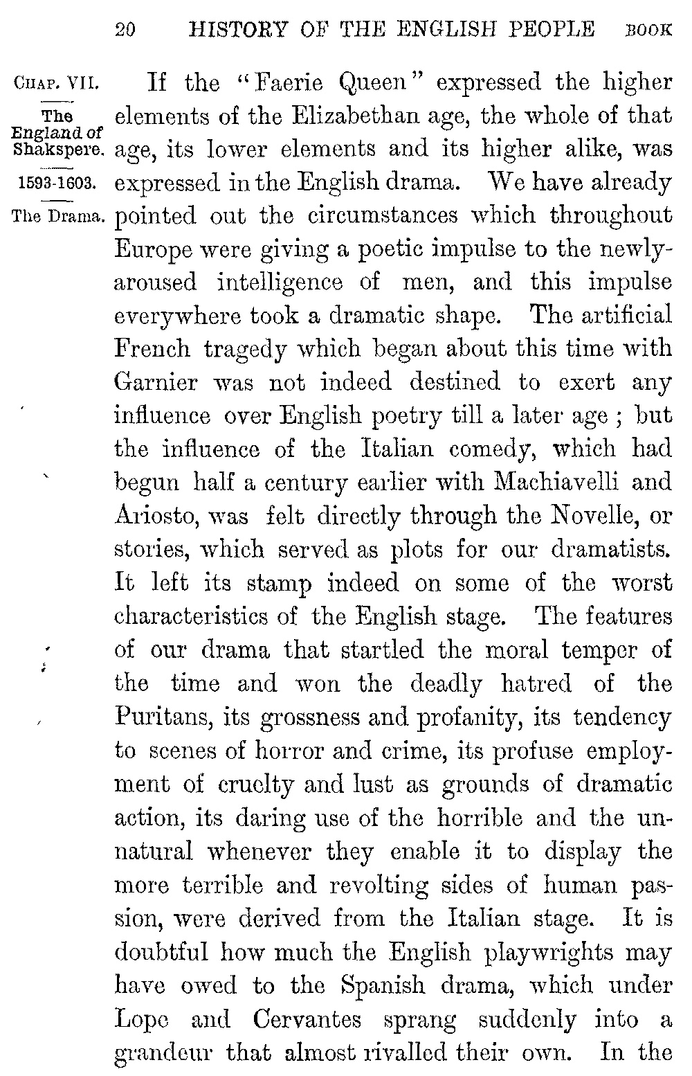 If the "Faerie Queen" expressed the higher elements of the Elizabethan age, the whole of that age, its lower elements and its higher alike, was expressed in the English drama. We have already pointed out the circumstances which throughout Europe were giving a poetic impulse to the newly-aroused intelligence of men, and this impulse everywhere took a dramatic shape. The artificial French tragedy which began about this time with Garnier was not indeed destined to exert any influence over English poetry till a later age; but the influence of the Italian comedy, which had begun half a century earlier with Machiavelli and Ariosto, was felt directly through the Novelle, or stories, which served as plots for our dramatists. It left its stamp indeed on some of the worst characteristics of the English stage. The features of our drama that startled the moral temper of the time and won the deadly hatred of the Puritans, its grossness and profanity, its tendency to scenes of horror and crime, its profuse employment of cruelty and lust as grounds of dramatic action, its daring use of the horrible and the unnatural whenever they enable it to display the more terrible and revolting sides of human passion, were derived from the Italian stage. It is doubtful how much the English playwrights may have owed to the Spanish drama, which under Lope and Cervantes sprang suddenly into a grandeur that almost rivalled their own. In the 5-021]intermixture of tragedy and comedy, in the abandonment of the solemn uniformity of poetic diction for the colloquial language of real life, the use of unexpected incidents, the complication of their plots and intrigues, the dramas of England and Spain are remarkably alike; but the likeness seems rather to have sprung from a similarity in the circumstances to which both owed their rise, than from any direct connexion of the one with the other. The real origin of the English drama, in fact, lay not in any influence from without but in the influence of England itself. The temper of the nation was dramatic. Ever since the Reformation, the Palace, the Inns of Court, and the University had been vying with one another in the production of plays; and so early was their popularity that even under Henry the Eighth it was found necessary to create a "Master of the Revels" to supervise them. Every progress of Elizabeth from shire to shire was a succession of shows and interludes. Dian with her nymphs met the Queen as she returned from hunting; Love presented her with his golden arrow as she passed through the gates of Norwich. From the earlier years of her reign the new spirit of the Renascence had been pouring itself into the rough mould of the Mystery Plays, whose allegorical virtues and vices, or scriptural heroes and heroines, had handed on the spirit of the drama through the Middle Ages. Adaptations from classical 5-022]pieces began to alternate with the purely religious "Moralities"; and an attempt at a livelier style of expression and invention appeared in the popular comedy of "Gammer Gurton's Needle"; while Sackville, Lord Dorset, in his tragedy of "Gorbudoc" made a bold effort at sublimity of diction, and introduced the use of blank verse as the vehicle of dramatic dialogue.