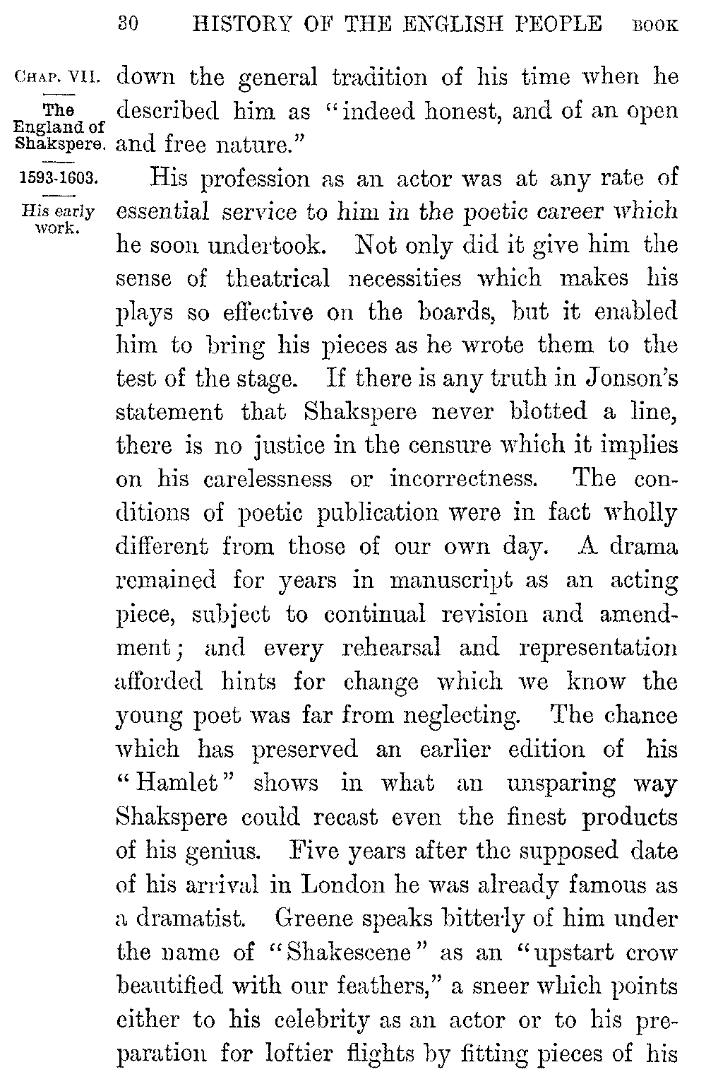 His profession as an actor was at any rate of essential service to him in the poetic career which he soon undertook. Not only did it give him the sense of theatrical necessities which makes his plays so effective on the boards, but it enabled him to bring his pieces as he wrote them to the test of the stage. If there is any truth in Jonson's statement that Shakspere never blotted a line, there is no justice in the censure which it implies on his carelessness or incorrectness. The conditions of poetic publication were in fact wholly different from those of our own day. A drama remained for years in manuscript as an acting piece, subject to continual revision and amendment; and every rehearsal and representation afforded hints for change which we know the young poet was far from neglecting. The chance which has preserved an earlier edition of his "Hamlet" shows in what an unsparing way Shakspere could recast even the finest products of his genius. Five years after the supposed date of his arrival in London he was already famous as a dramatist. Greene speaks bitterly of him under the name of "Shakescene" as an "upstart crow beautified with our feathers," a sneer which points either to his celebrity as an actor or to his preparation for loftier flights by fitting pieces of his 5-031]predecessors for the stage. He was soon partner in the theatre, actor, and playwright; and another nickname, that of "Johannes Factotum" or Jack-of-all-Trades, shows his readiness to take all honest work which came to hand.