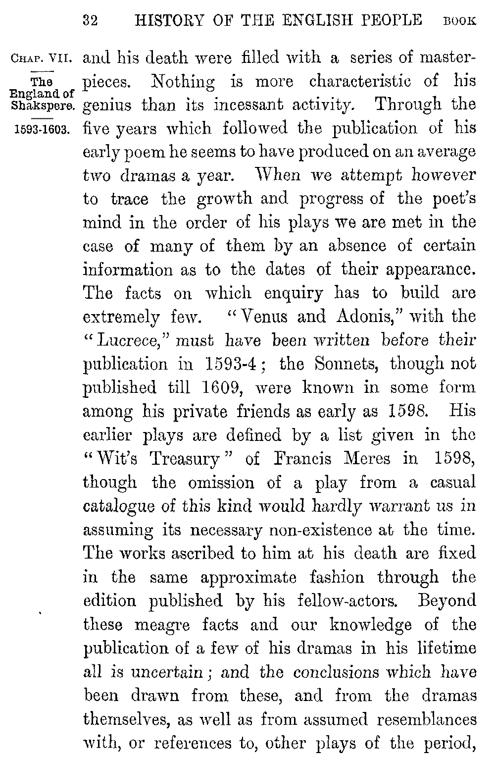 With his publication in 1593 of the poem of "Venus and Adonis," "the first heir of my invention," as Shakspere calls it, the period of independent creation fairly began. The date of its publication was a very memorable one. The "Faerie Queen" had appeared only three years before, and had placed Spenser without a rival at the head of English poetry. On the other hand the two leading dramatists of the time passed at this moment suddenly away. Greene died in poverty and self-reproach in the house of a poor shoemaker. "Doll," he wrote to the wife he had abandoned, "I charge thee, by the love of our youth and by my soul's rest, that thou wilt see this man paid; for if he and his wife had not succoured me I had died in the streets." "Oh that a year were granted me to live," cried the young poet from his bed of death, "but I must die, of every man abhorred! Time, loosely spent, will not again be won! My time is loosely spent—and I undone!" A year later the death of Marlowe in a street brawl removed the only rival whose powers might have equalled Shakspere's own. He was now about thirty; and the twenty-three years which elapsed between the appearance of the "Adonis" 5-032]and his death were filled with a series of masterpieces. Nothing is more characteristic of his genius than its incessant activity. Through the five years which followed the publication of his early poem he seems to have produced on an average two dramas a year. When we attempt however to trace the growth and progress of the poet's mind in the order of his plays we are met in the case of many of them by an absence of certain information as to the dates of their appearance. The facts on which enquiry has to build are extremely few. "Venus and Adonis," with the "Lucrece," must have been written before their publication in 1593-4; the Sonnets, though not published till 1609, were known in some form among his private friends as early as 1598. His earlier plays are defined by a list given in the "Wit's Treasury" of Francis Meres in 1598, though the omission of a play from a casual catalogue of this kind would hardly warrant us in assuming its necessary non-existence at the time. The works ascribed to him at his death are fixed in the same approximate fashion through the edition published by his fellow-actors. Beyond these meagre facts and our knowledge of the publication of a few of his dramas in his lifetime all is uncertain; and the conclusions which have been drawn from these, and from the dramas themselves, as well as from assumed resemblances with, or references to, other plays of the period, 5-033]can only be accepted as approximations to the truth.