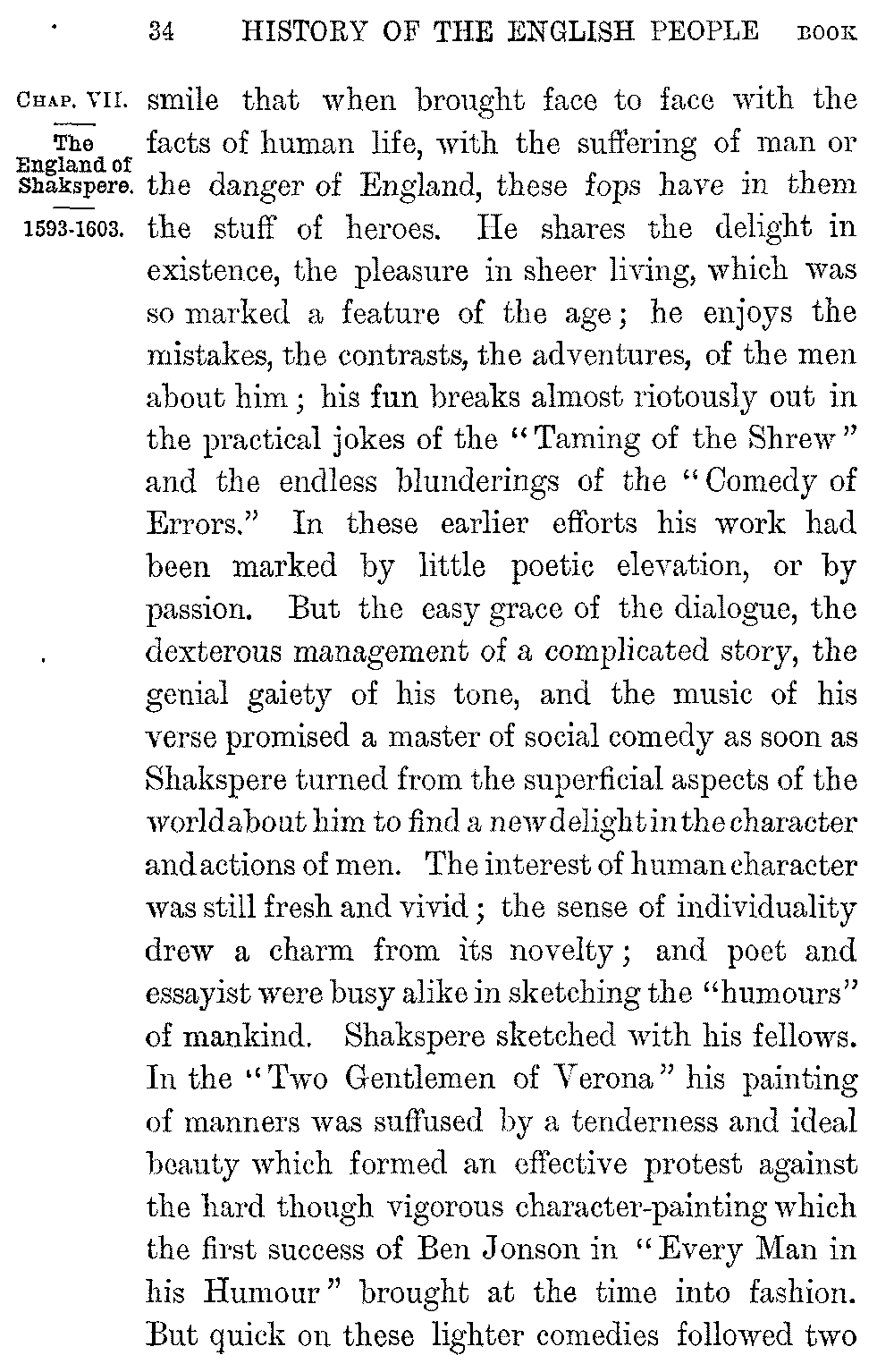 The bulk of his lighter comedies and historical dramas can be assigned with fair probability to a period from about 1593, when Shakspere was known as nothing more than an adapter, to 1598, when they are mentioned in the list of Meres. They bear on them indeed the stamp of youth. In "Love's Labour's Lost" the young playwright, fresh from his own Stratford, its "daisies pied and violets blue," with the gay bright music of its country ditties still in his ears, flings himself into the midst of the brilliant England which gathered round Elizabeth, busying himself as yet for the most part with the surface of it, with the humours and quixotisms, the wit and the whim, the unreality, the fantastic extravagance, which veiled its inner nobleness. Country-lad as he is, Shakspere shows himself master of it all; he can patter euphuism and exchange quip and repartee with the best; he is at home in their pedantries and affectations, their brag and their rhetoric, their passion for the fantastic and the marvellous. He can laugh as heartily at the romantic vagaries of the courtly world in which he finds himself as at the narrow dulness, the pompous triflings, of the country world which he has left behind him. But he laughs frankly and without malice; he sees the real grandeur of soul which underlies all this quixotry and word-play; and owns with a 5-034]smile that when brought face to face with the facts of human life, with the suffering of man or the danger of England, these fops have in them the stuff of heroes. He shares the delight in existence, the pleasure in sheer living, which was so marked a feature of the age; he enjoys the mistakes, the contrasts, the adventures, of the men about him; his fun breaks almost riotously out in the practical jokes of the "Taming of the Shrew" and the endless blunderings of the "Comedy of Errors." In these earlier efforts his work had been marked by little poetic elevation, or by passion. But the easy grace of the dialogue, the dexterous management of a complicated story, the genial gaiety of his tone, and the music of his verse promised a master of social comedy as soon as Shakspere turned from the superficial aspects of the world about him to find a new delight in the character and actions of men. The interest of human character was still fresh and vivid; the sense of individuality drew a charm from its novelty; and poet and essayist were busy alike in sketching the "humours" of mankind. Shakspere sketched with his fellows. In the "Two Gentlemen of Verona" his painting of manners was suffused by a tenderness and ideal beauty which formed an effective protest against the hard though vigorous character-painting which the first success of Ben Jonson in "Every Man in his Humour" brought at the time into fashion. But quick on these lighter comedies followed two 5-035]in which his genius started fully into life. His poetic power, held in reserve till now, showed itself with a splendid profusion in the brilliant fancies of the "Midsummer Night's Dream"; and passion swept like a tide of resistless delight through "Romeo and Juliet."