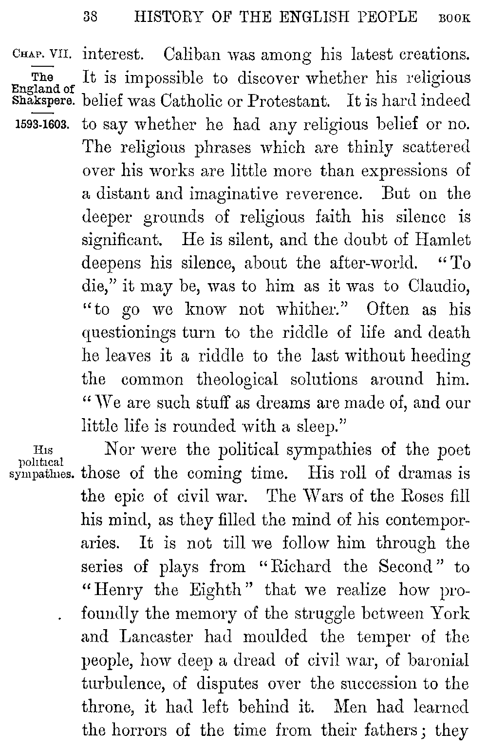 From this new world of thought and feeling Shakspere stood aloof. Turn as others might to the speculations of theology, man and man's nature remained with him an inexhaustible subject of 5-038]interest. Caliban was among his latest creations. It is impossible to discover whether his religious belief was Catholic or Protestant. It is hard indeed to say whether he had any religious belief or no. The religious phrases which are thinly scattered over his works are little more than expressions of a distant and imaginative reverence. But on the deeper grounds of religious faith his silence is significant. He is silent, and the doubt of Hamlet deepens his silence, about the after-world. "To die," it may be, was to him as it was to Claudio, "to go we know not whither." Often as his questionings turn to the riddle of life and death he leaves it a riddle to the last without heeding the common theological solutions around him. "We are such stuff as dreams are made of, and our little life is rounded with a sleep."