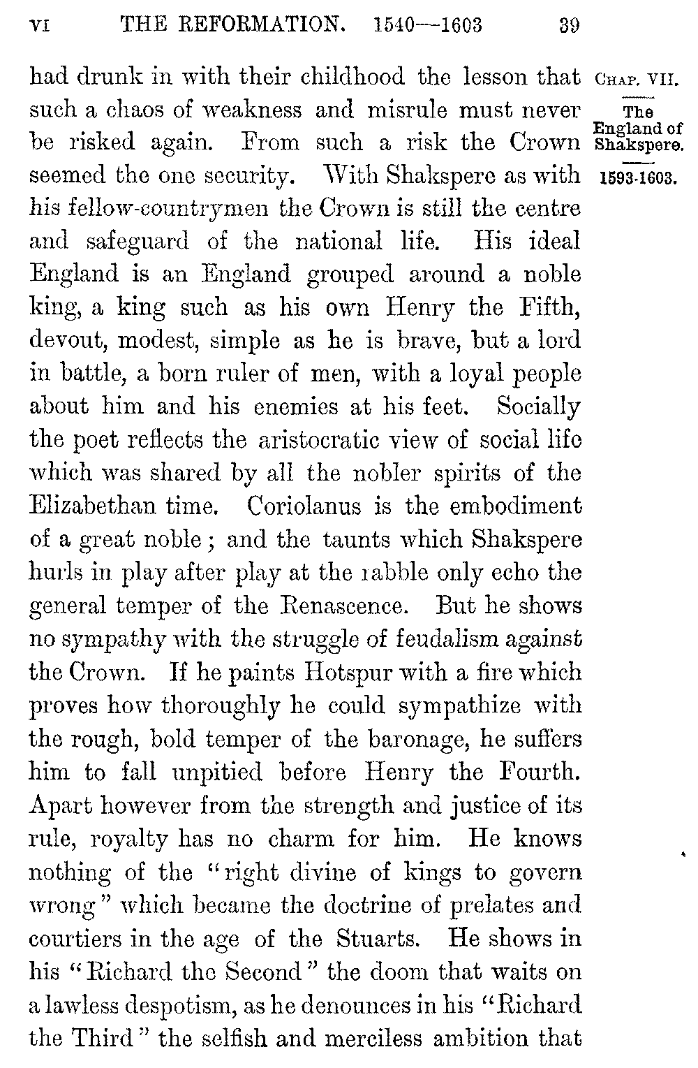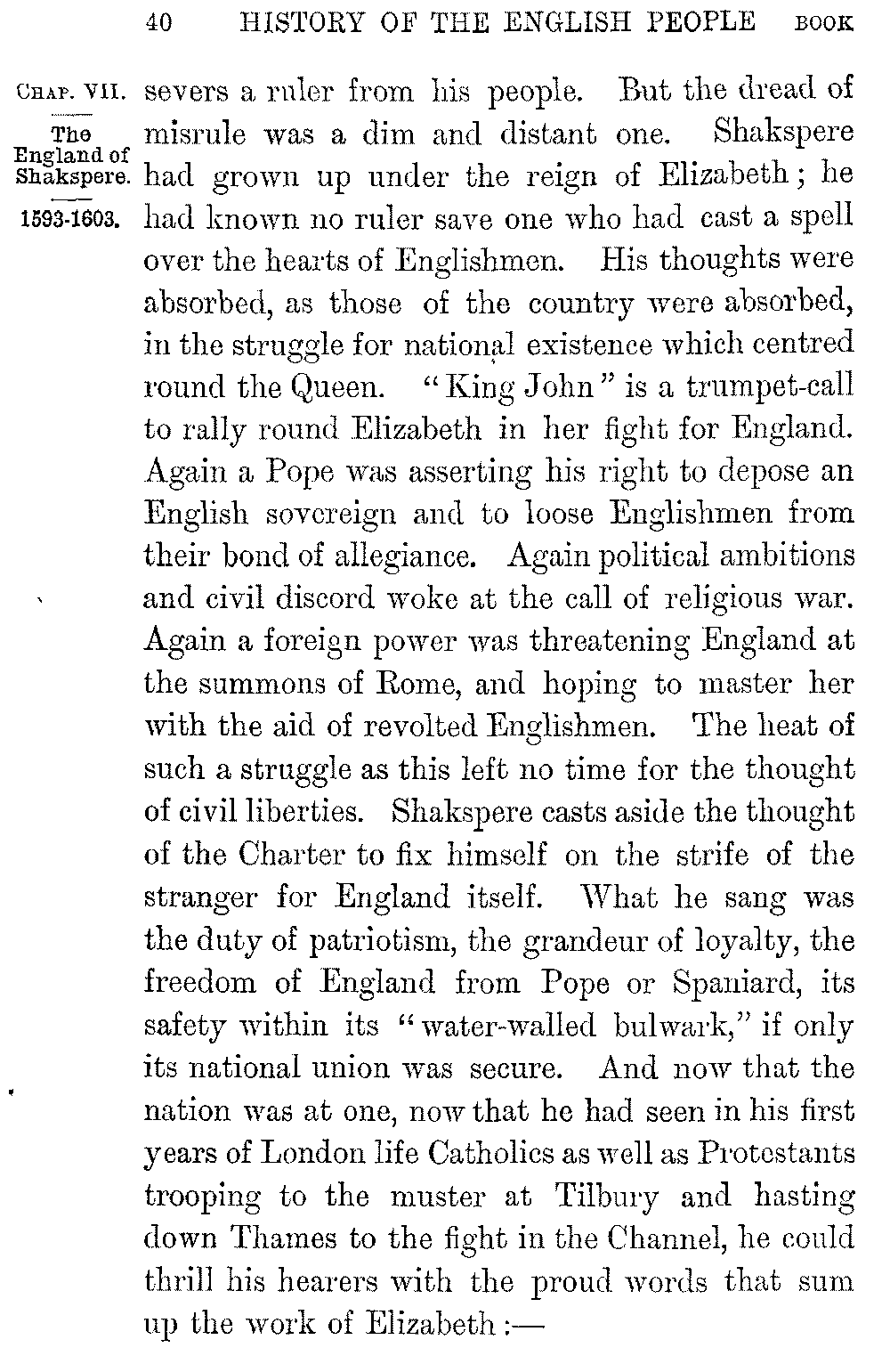 Nor were the political sympathies of the poet those of the coming time. His roll of dramas is the epic of civil war. The Wars of the Roses fill his mind, as they filled the mind of his contemporaries. It is not till we follow him through the series of plays from "Richard the Second" to "Henry the Eighth" that we realize how profoundly the memory of the struggle between York and Lancaster had moulded the temper of the people, how deep a dread of civil war, of baronial turbulence, of disputes over the succession to the throne, it had left behind it. Men had learned the horrors of the time from their fathers; they 5-039]had drunk in with their childhood the lesson that such a chaos of weakness and misrule must never be risked again. From such a risk the Crown seemed the one security. With Shakspere as with his fellow-countrymen the Crown is still the centre and safeguard of the national life. His ideal England is an England grouped around a noble king, a king such as his own Henry the Fifth, devout, modest, simple as he is brave, but a lord in battle, a born ruler of men, with a loyal people about him and his enemies at his feet. Socially the poet reflects the aristocratic view of social life which was shared by all the nobler spirits of the Elizabethan time. Coriolanus is the embodiment of a great noble; and the taunts which Shakspere hurls in play after play at the rabble only echo the general temper of the Renascence. But he shows no sympathy with the struggle of feudalism against the Crown. If he paints Hotspur with a fire which proves how thoroughly he could sympathize with the rough, bold temper of the baronage, he suffers him to fall unpitied before Henry the Fourth. Apart however from the strength and justice of its rule, royalty has no charm for him. He knows nothing of the "right divine of kings to govern wrong" which became the doctrine of prelates and courtiers in the age of the Stuarts. He shows in his "Richard the Second" the doom that waits on a lawless despotism, as he denounces in his "Richard the Third" the selfish and merciless ambition that 5-040]severs a ruler from his people. But the dread of misrule was a dim and distant one. Shakspere had grown up under the reign of Elizabeth; he had known no ruler save one who had cast a spell over the hearts of Englishmen. His thoughts were absorbed, as those of the country were absorbed, in the struggle for national existence which centred round the Queen. "King John" is a trumpet-call to rally round Elizabeth in her fight for England. Again a Pope was asserting his right to depose an English sovereign and to loose Englishmen from their bond of allegiance. Again political ambitions and civil discord woke at the call of religious war. Again a foreign power was threatening England at the summons of Rome, and hoping to master her with the aid of revolted Englishmen. The heat of such a struggle as this left no time for the thought of civil liberties. Shakspere casts aside the thought of the Charter to fix himself on the strife of the stranger for England itself. What he sang was the duty of patriotism, the grandeur of loyalty, the freedom of England from Pope or Spaniard, its safety within its "water-walled bulwark," if only its national union was secure. And now that the nation was at one, now that he had seen in his first years of London life Catholics as well as Protestants trooping to the muster at Tilbury and hasting down Thames to the fight in the Channel, he could thrill his hearers with the proud words that sum up the work of Elizabeth:—