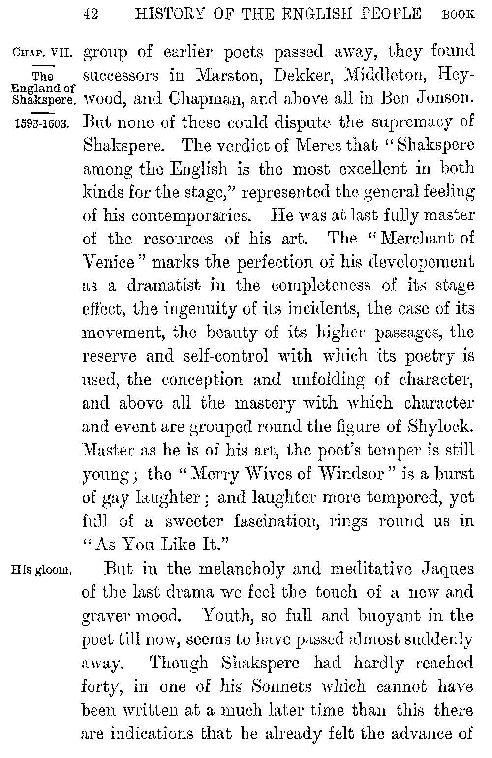 With this great series of historical and social dramas Shakspere had passed far beyond his fellows whether as a tragedian or as a writer of comedy. "The Muses," said Meres in 1598, "would speak with Shakspere's fine-filed phrase, if they would speak English." His personal popularity was now at its height. His pleasant temper and the vivacity of his wit had drawn him early into contact with the young Earl of Southampton, to whom his "Adonis" and "Lucrece" are dedicated; and the different tone of the two dedications shows how rapidly acquaintance ripened into an ardent friendship. Shakspere's wealth and influence too were growing fast. He had property both in Stratford and London, and his fellow-townsmen made him their suitor to Lord Burleigh for favours to be bestowed on Stratford. He was rich enough to aid his father, and to buy the house at Stratford which afterwards became his home. The tradition that Elizabeth was so pleased with Falstaff in "Henry the Fourth" that she ordered the poet to show her Falstaff in love—an order which produced the "Merry Wives of Windsor"—whether true or false, proves his repute as a playwright. As the 5-042]group of earlier poets passed away, they found successors in Marston, Dekker, Middleton, Heywood, and Chapman, and above all in Ben Jonson. But none of these could dispute the supremacy of Shakspere. The verdict of Meres that "Shakspere among the English is the most excellent in both kinds for the stage," represented the general feeling of his contemporaries. He was at last fully master of the resources of his art. The "Merchant of Venice" marks the perfection of his developement as a dramatist in the completeness of its stage effect, the ingenuity of its incidents, the ease of its movement, the beauty of its higher passages, the reserve and self-control with which its poetry is used, the conception and unfolding of character, and above all the mastery with which character and event are grouped round the figure of Shylock. Master as he is of his art, the poet's temper is still young; the "Merry Wives of Windsor" is a burst of gay laughter; and laughter more tempered, yet full of a sweeter fascination, rings round us in "As You Like It."