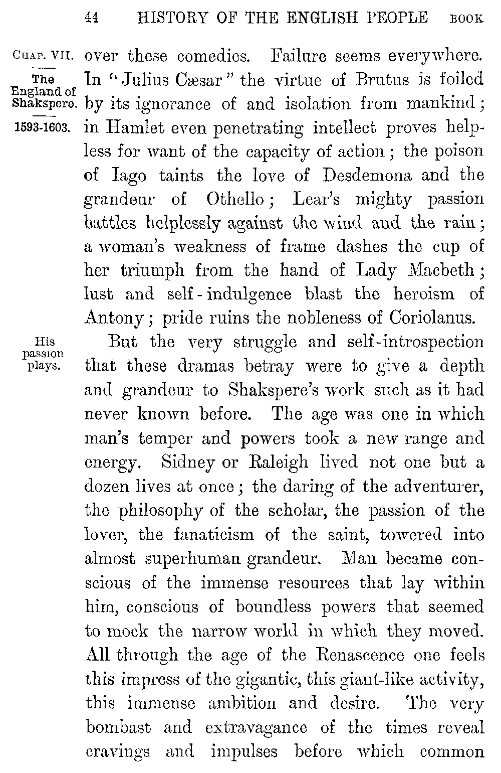 But the very struggle and self-introspection that these dramas betray were to give a depth and grandeur to Shakspere's work such as it had never known before. The age was one in which man's temper and powers took a new range and energy. Sidney or Raleigh lived not one but a dozen lives at once; the daring of the adventurer, the philosophy of the scholar, the passion of the lover, the fanaticism of the saint, towered into almost superhuman grandeur. Man became conscious of the immense resources that lay within him, conscious of boundless powers that seemed to mock the narrow world in which they moved. All through the age of the Renascence one feels this impress of the gigantic, this giant-like activity, this immense ambition and desire. The very bombast and extravagance of the times reveal cravings and impulses before which common 5-045]speech broke down. It is this grandeur of humanity that finds its poetic expression in the later work of Shakspere. As the poet penetrated deeper and deeper into the recesses of the soul, he saw how great and wondrous a thing was man. "What a piece of work is a man," cries Hamlet; "how noble in reason; how infinite in faculty; in form and moving how express and admirable; in action how like an angel; in apprehension how like a god; the beauty of the world; the paragon of animals!" It is the wonder of man that spreads before us as the poet pictures the wide speculation of Hamlet, the awful convulsion of a great nature in Othello, the terrible storm in the soul of Lear which blends with the very storm of the heavens themselves, the awful ambition that nerved a woman's hand to dabble itself with the blood of a murdered king, the reckless lust that "flung away a world for love." Amid the terror and awe of these great dramas we learn something of the vast forces of the age from which they sprang. The passion of Mary Stuart, the ruthlessness of Alva, the daring of Drake, the chivalry of Sidney, the range of thought and action in Raleigh or Elizabeth, come better home to us as we follow the mighty series of tragedies which began in "Hamlet" and ended in "Coriolanus."