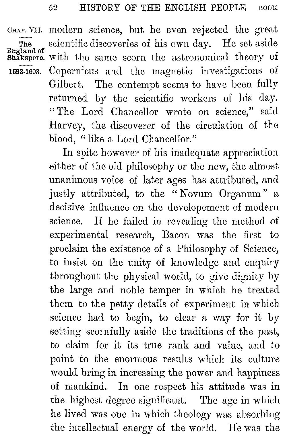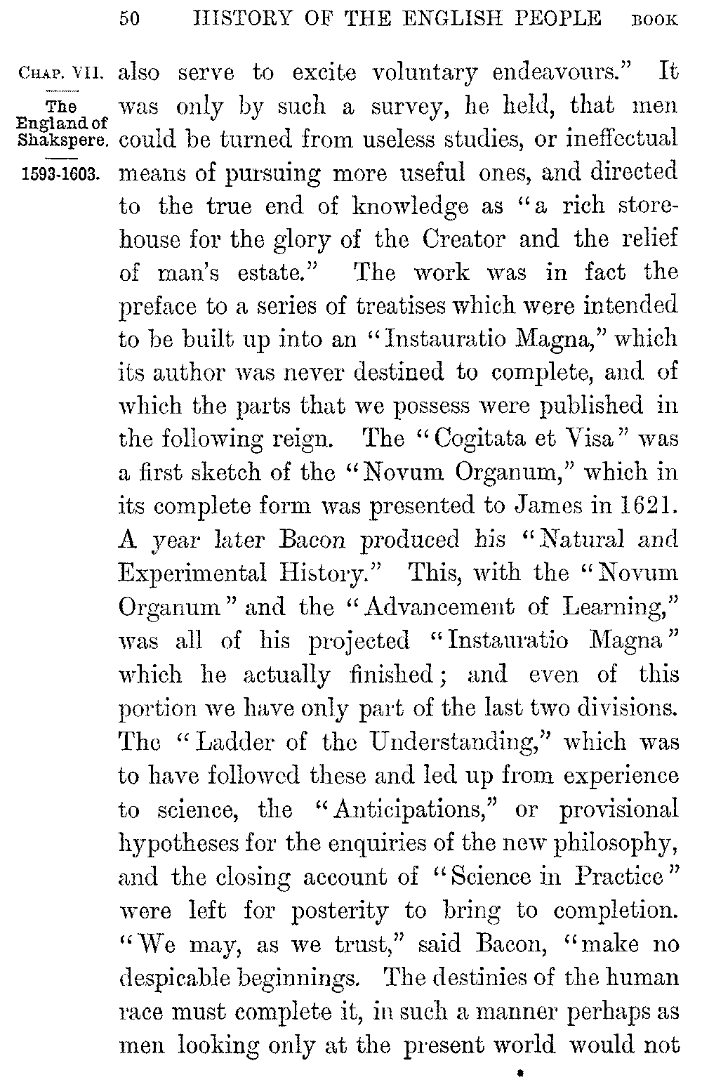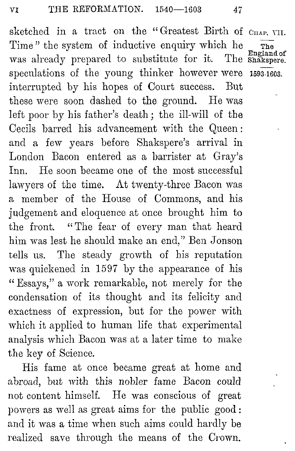 Shakspere's last dramas, the three exquisite works in which he shows a soul at rest with itself 5-046]and with the world, "Cymbeline," "The Tempest," "Winter's Tale," were written in the midst of ease and competence, in a house at Stratford to which he withdrew a few years after the death of Elizabeth. In them we lose all relation with the world or the time and pass into a region of pure poetry. It is in this peaceful and gracious close that the life of Shakspere contrasts most vividly with that of his greatest contemporary. If the imaginative resources of the new England were seen in the creators of Hamlet and the Faerie Queen, its purely intellectual capacity, its vast command over the stores of human knowledge, the amazing sense of its own powers with which it dealt with them, were seen in the work of Francis Bacon. Bacon was born in 1561, three years before the birth of Shakspere. He was the younger son of a Lord Keeper, as well as the nephew of Lord Burleigh, and even in childhood his quickness and sagacity won the favour of the Queen. Elizabeth "delighted much to confer with him, and to prove him with questions: unto which he delivered himself with that gravity and maturity above his years that her Majesty would often term him 'the young Lord Keeper.'" Even as a boy at college he expressed his dislike of the Aristotelian philosophy, as "a philosophy only strong for disputations and contentions but barren of the production of works for the benefit of the life of man." As a law student of twenty-one he 5-047]sketched in a tract on the "Greatest Birth of Time" the system of inductive enquiry which he was already prepared to substitute for it. The speculations of the young thinker however were interrupted by his hopes of Court success. But these were soon dashed to the ground. He was left poor by his father's death; the ill-will of the Cecils barred his advancement with the Queen: and a few years before Shakspere's arrival in London Bacon entered as a barrister at Gray's Inn. He soon became one of the most successful lawyers of the time. At twenty-three Bacon was a member of the House of Commons, and his judgement and eloquence at once brought him to the front. "The fear of every man that heard him was lest he should make an end," Ben Jonson tells us. The steady growth of his reputation was quickened in 1597 by the appearance of his "Essays," a work remarkable, not merely for the condensation of its thought and its felicity and exactness of expression, but for the power with which it applied to human life that experimental analysis which Bacon was at a later time to make the key of Science.