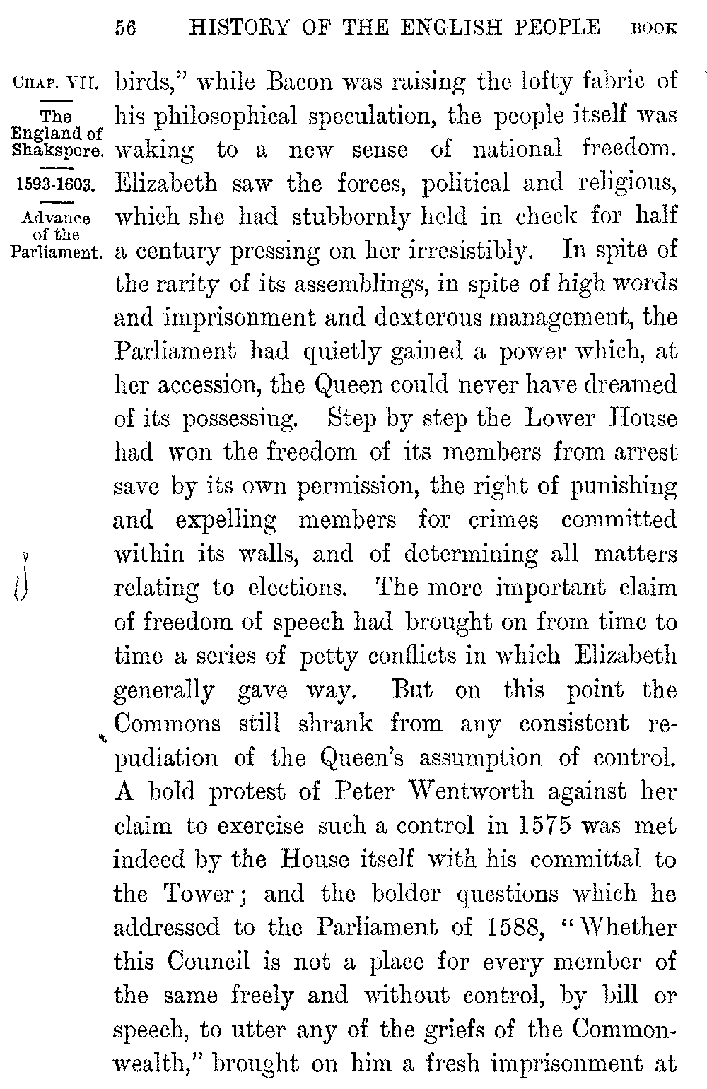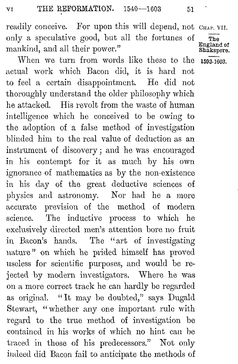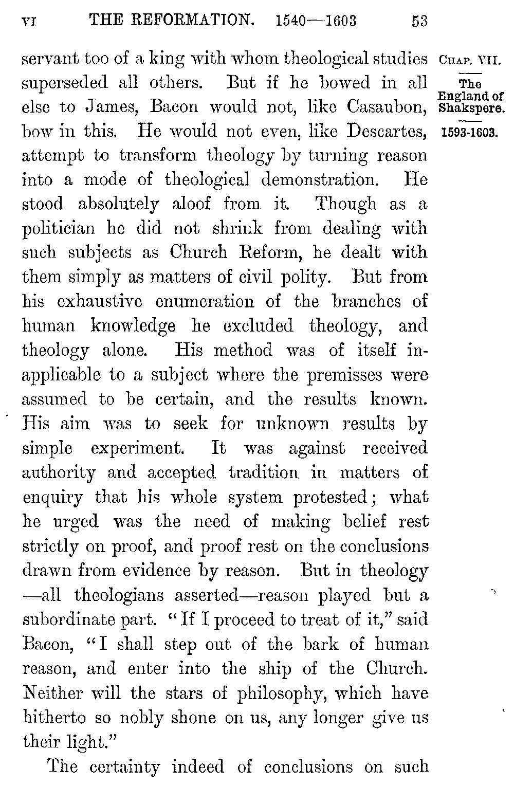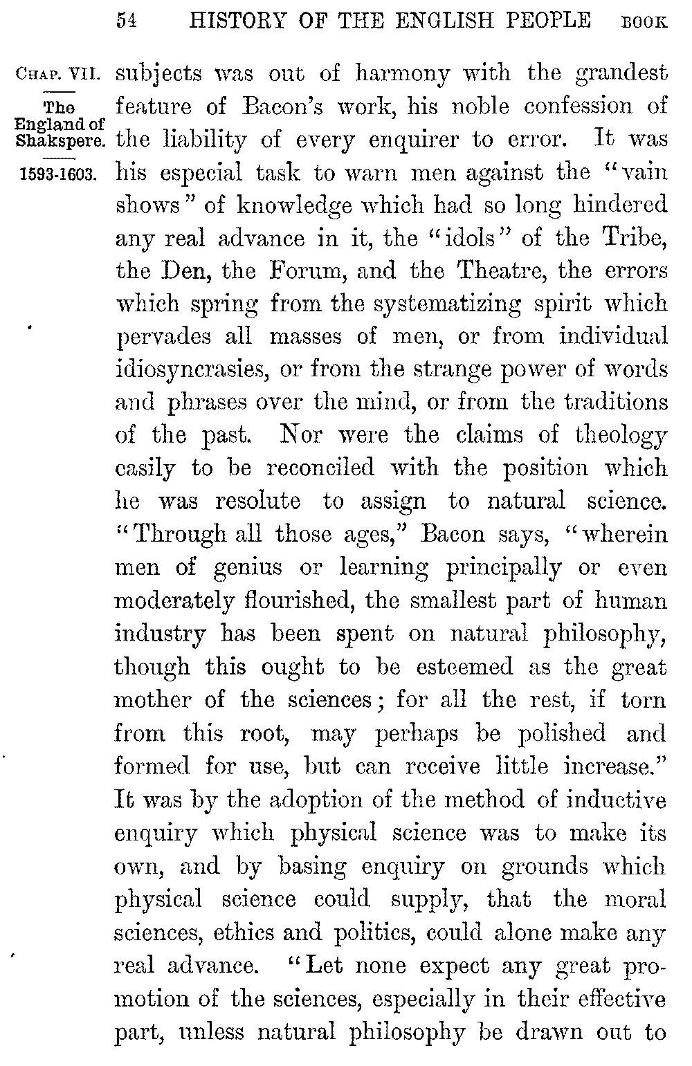 Shakspere's last dramas, the three exquisite works in which he shows a soul at rest with itself 5-046]and with the world, "Cymbeline," "The Tempest," "Winter's Tale," were written in the midst of ease and competence, in a house at Stratford to which he withdrew a few years after the death of Elizabeth. In them we lose all relation with the world or the time and pass into a region of pure poetry. It is in this peaceful and gracious close that the life of Shakspere contrasts most vividly with that of his greatest contemporary. If the imaginative resources of the new England were seen in the creators of Hamlet and the Faerie Queen, its purely intellectual capacity, its vast command over the stores of human knowledge, the amazing sense of its own powers with which it dealt with them, were seen in the work of Francis Bacon. Bacon was born in 1561, three years before the birth of Shakspere. He was the younger son of a Lord Keeper, as well as the nephew of Lord Burleigh, and even in childhood his quickness and sagacity won the favour of the Queen. Elizabeth "delighted much to confer with him, and to prove him with questions: unto which he delivered himself with that gravity and maturity above his years that her Majesty would often term him 'the young Lord Keeper.'" Even as a boy at college he expressed his dislike of the Aristotelian philosophy, as "a philosophy only strong for disputations and contentions but barren of the production of works for the benefit of the life of man." As a law student of twenty-one he 5-047]sketched in a tract on the "Greatest Birth of Time" the system of inductive enquiry which he was already prepared to substitute for it. The speculations of the young thinker however were interrupted by his hopes of Court success. But these were soon dashed to the ground. He was left poor by his father's death; the ill-will of the Cecils barred his advancement with the Queen: and a few years before Shakspere's arrival in London Bacon entered as a barrister at Gray's Inn. He soon became one of the most successful lawyers of the time. At twenty-three Bacon was a member of the House of Commons, and his judgement and eloquence at once brought him to the front. "The fear of every man that heard him was lest he should make an end," Ben Jonson tells us. The steady growth of his reputation was quickened in 1597 by the appearance of his "Essays," a work remarkable, not merely for the condensation of its thought and its felicity and exactness of expression, but for the power with which it applied to human life that experimental analysis which Bacon was at a later time to make the key of Science.