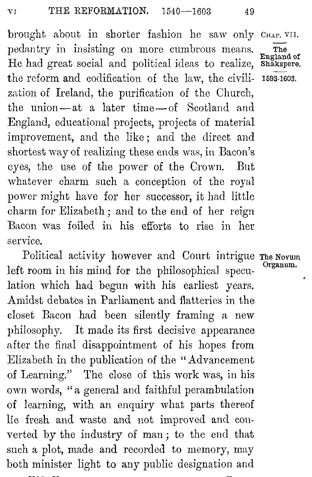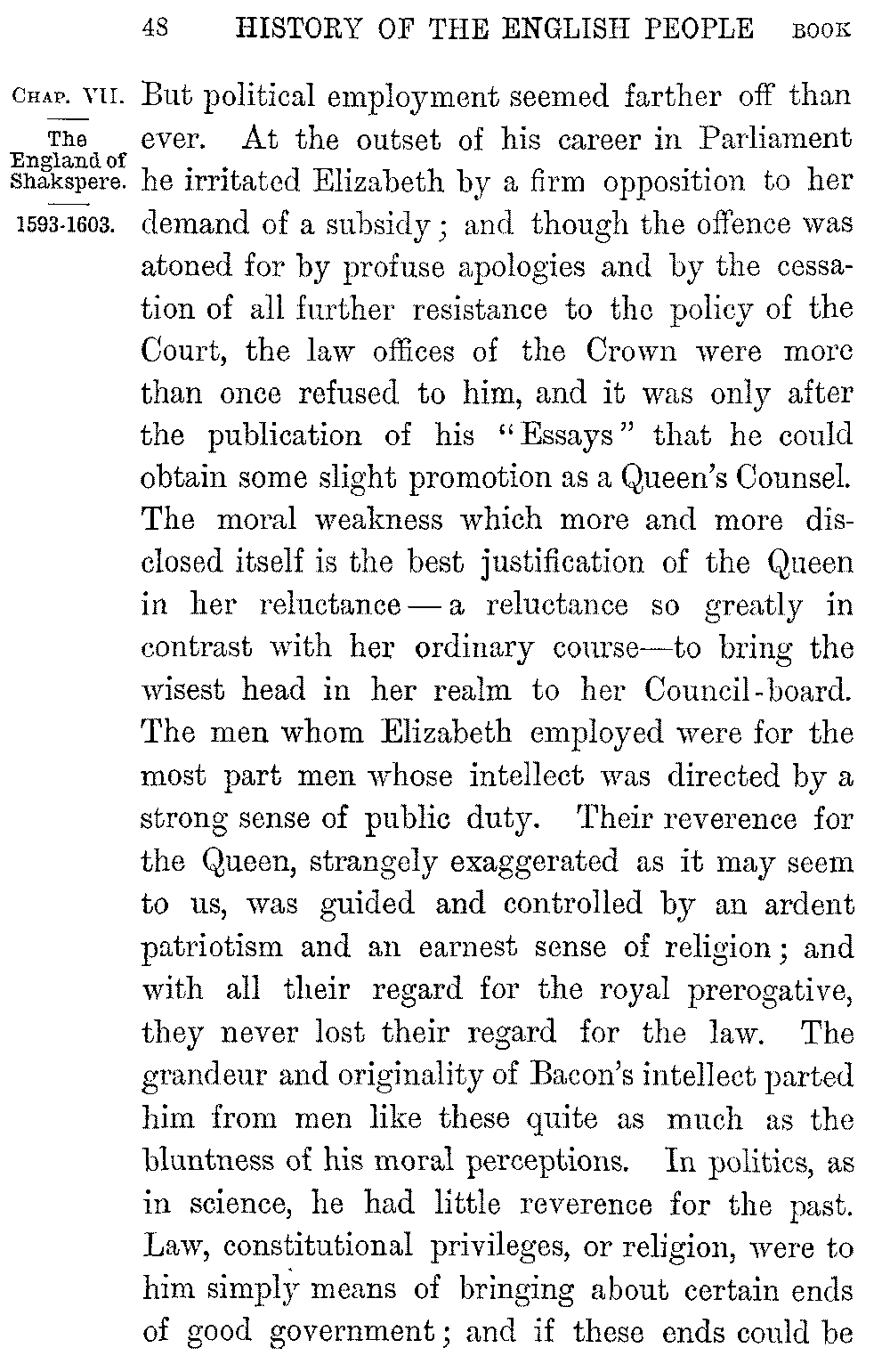 His fame at once became great at home and abroad, but with this nobler fame Bacon could not content himself. He was conscious of great powers as well as great aims for the public good: and it was a time when such aims could hardly be realized save through the means of the Crown. 5-048]But political employment seemed farther off than ever. At the outset of his career in Parliament he irritated Elizabeth by a firm opposition to her demand of a subsidy; and though the offence was atoned for by profuse apologies and by the cessation of all further resistance to the policy of the Court, the law offices of the Crown were more than once refused to him, and it was only after the publication of his "Essays" that he could obtain some slight promotion as a Queen's Counsel. The moral weakness which more and more disclosed itself is the best justification of the Queen in her reluctance—a reluctance so greatly in contrast with her ordinary course—to bring the wisest head in her realm to her Council-board. The men whom Elizabeth employed were for the most part men whose intellect was directed by a strong sense of public duty. Their reverence for the Queen, strangely exaggerated as it may seem to us, was guided and controlled by an ardent patriotism and an earnest sense of religion; and with all their regard for the royal prerogative, they never lost their regard for the law. The grandeur and originality of Bacon's intellect parted him from men like these quite as much as the bluntness of his moral perceptions. In politics, as in science, he had little reverence for the past. Law, constitutional privileges, or religion, were to him simply means of bringing about certain ends of good government; and if these ends could be 5-049]brought about in shorter fashion he saw only pedantry in insisting on more cumbrous means. He had great social and political ideas to realize, the reform and codification of the law, the civilization of Ireland, the purification of the Church, the union—at a later time—of Scotland and England, educational projects, projects of material improvement, and the like; and the direct and shortest way of realizing these ends was, in Bacon's eyes, the use of the power of the Crown. But whatever charm such a conception of the royal power might have for her successor, it had little charm for Elizabeth; and to the end of her reign Bacon was foiled in his efforts to rise in her service.