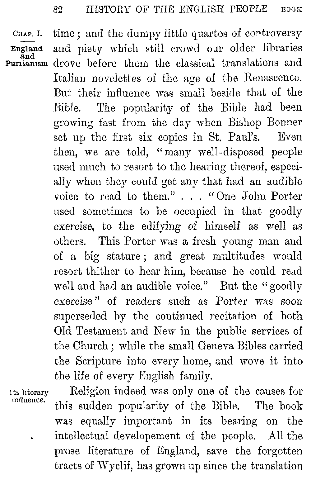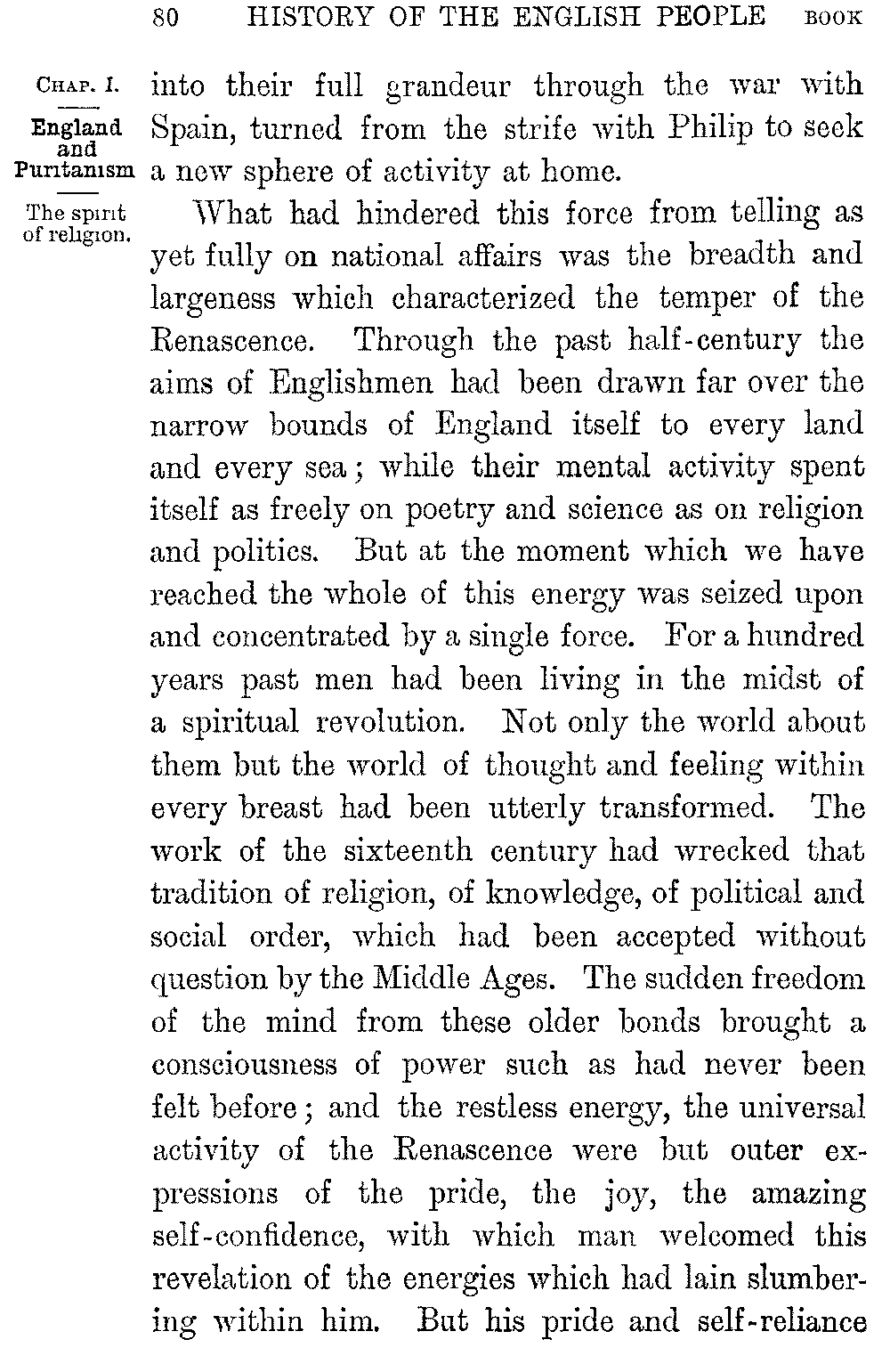 It is characteristic of England that the first kind of literature to rise from its long death was the literature of history. But the form in which it rose marked the difference between the world in which it had perished and that in which it reappeared. During the Middle Ages the world had been without a past, save the shadowy and unknown past of early Rome; and annalist and chronicler told the story of the years which went before as a preface to their tale of the present without a sense of any difference between them. But the religious, social, and political change which passed over England under the New Monarchy broke the continuity of its life; and the depth of the rift between the two ages is seen by the way in which History passes on its revival under Elizabeth from the mediæval form of pure narrative to its modern form of an investigation and reconstruction of the past. The new interest which attached to the bygone world led to the collection of its annals, their reprinting and embodiment in an English shape. It was his desire to give the Elizabethan 5-004]Church a basis in the past, as much as any pure zeal for letters, which induced Archbishop Parker to lead the way in the first of these labours. The collection of historical manuscripts which, following in the track of Leland, he rescued from the wreck of the monastic libraries created a school of antiquarian imitators, whose research and industry have preserved for us almost every work of permanent historical value which existed before the Dissolution of the Monasteries. To his publication of some of our earlier chronicles we owe the series of similar publications which bear the name of Camden, Twysden, and Gale. But as a branch of literature, English History in the new shape which we have noted began in the work of the poet Daniel. The chronicles of Stowe and Speed, who preceded him, are simple records of the past, often copied almost literally from the annals they used, and utterly without style or arrangement; while Daniel, inaccurate and superficial as he is, gave his story a literary form and embodied it in a pure and graceful prose. Two larger works at the close of Elizabeth's reign, the "History of the Turks" by Knolles, and Raleigh's vast but unfinished plan of the "History of the World," showed a widening of historic interest beyond the merely national bounds to which it had hitherto been confined.