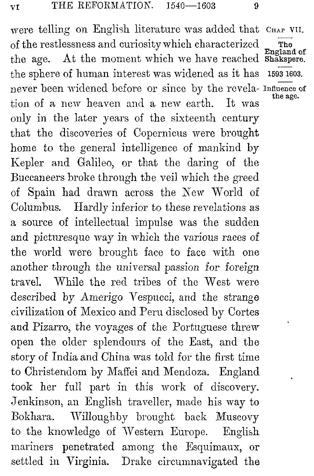 But to the national and local influences which 5-009]were telling on English literature was added that of the restlessness and curiosity which characterized the age. At the moment which we have reached the sphere of human interest was widened as it has never been widened before or since by the revelation of a new heaven and a new earth. It was only in the later years of the sixteenth century that the discoveries of Copernicus were brought home to the general intelligence of mankind by Kepler and Galileo, or that the daring of the Buccaneers broke through the veil which the greed of Spain had drawn across the New World of Columbus. Hardly inferior to these revelations as a source of intellectual impulse was the sudden and picturesque way in which the various races of the world were brought face to face with one another through the universal passion for foreign travel. While the red tribes of the West were described by Amerigo Vespucci, and the strange civilization of Mexico and Peru disclosed by Cortes and Pizarro, the voyages of the Portuguese threw open the older splendours of the East, and the story of India and China was told for the first time to Christendom by Maffei and Mendoza. England took her full part in this work of discovery. Jenkinson, an English traveller, made his way to Bokhara. Willoughby brought back Muscovy to the knowledge of Western Europe. English mariners penetrated among the Esquimaux, or settled in Virginia. Drake circumnavigated the 5-010]globe. The "Collection of Voyages" which was published by Hakluyt in 1582 disclosed the vastness of the world itself, the infinite number of the races of mankind, the variety of their laws, their customs, their religions, their very instincts. We see the influence of this new and wider knowledge of the world, not only in the life and richness which it gave to the imagination of the time, but in the immense interest which from this moment attached itself to Man. Shakspere's conception of Caliban, like the questioning of Montaigne, marks the beginning of a new and a truer, because a more inductive, philosophy of human nature and human history. The fascination exercised by the study of human character showed itself in the essays of Bacon, and yet more in the wonderful popularity of the drama.