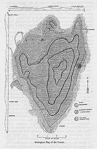 The Geology of the Forest and its Minerals—Their character in general—Description of the beds of conglomerate, mountain limestone, iron veins, millstone grit, and lower coal measures—“The Coleford High Delf”—Elevation of the Forest range of hills—The middle coal veins—The upper veins—Mr. Mushet’s analysis of the Forest coal—Their fossils—The stone-quarries of the district