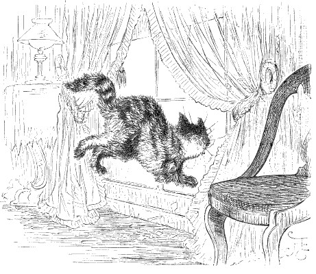 out, from Mary's talk with the Irishwoman, what they were planning to do. But I never could understand Irish, and although I listened till I had cramps in all my legs, from being so long in one position, I was no wiser. Even the things Mary said I could not understand, and I usually understand her very easily. I passed a very uncomfortable night in the carrot bin. As soon as I heard Mary coming down the cellar stairs, this morning, I hid in the arch, and while she was skimming the milk, I slipped upstairs, and ran into the sitting-room. Every thing there is in the same confusion; the carpet is gone; and the windows too, and I think some of the chairs have been carried away. All the china is in great baskets on the pantry floor; and your father and mother's clothes are all taken out of the nursery closet, and laid on chairs. It is very dreadful to have to stand and see all this, and not be able to do any thing. I don't think I ever fully realized before the disadvantage of being only a cat. I have just been across the street, and talked it all over with the Judge's cat, but she is very old and stupid, and so taken up with her six kittens (who are the ugliest I ever saw), that she does not take the least interest in her neighbors' affairs. Mrs. Hitchcock walked by the house this morning, and I ran out to her, and took her dress in my teeth and pulled it, and did all I could to make her come in, but she said, "No, no, pussy, I'm not coming in to-day; your mistress is not at home." I declare I could have cried. I sat down in the middle of the path, and never stirred for half an hour.