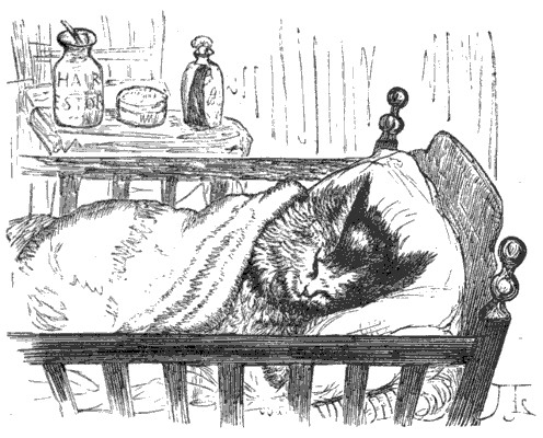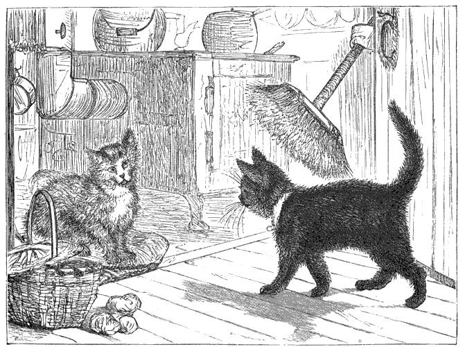 toned voices I ever heard. One day, after I got well enough to be in the kitchen, he slipped in, between the legs of the butcher's boy who was bringing in some meat; but before I had time to say one word to him, Mary flew at him with the broom, and drove him out. However, he saw that I was alive, and that was something. I am afraid it will be some days yet before I can see him again, for they do not let me go out at all, and the bandages are not taken off my leg. The cradle is carried upstairs, and I sleep on Charlie's blanket behind the stove. I heard your mother say to-day that she really believed the cat had the rheumatism. I do not know what that is, but I think I have got it: it hurts me all over when I walk, and I feel as if I looked like Bill Jacobs's old cat, who, they say, is older than the oldest man in town; but of course that must be a slander.