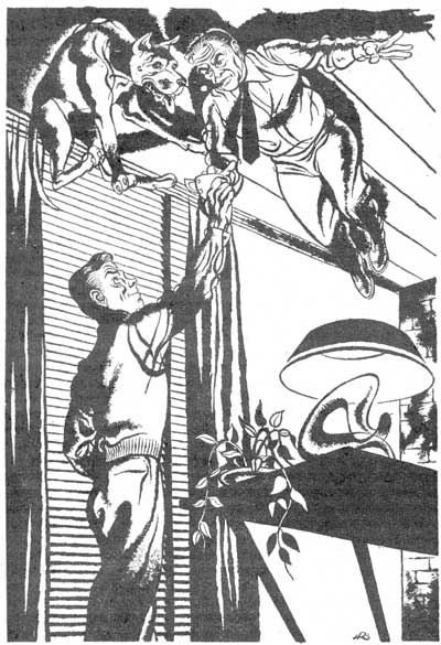 "I don't know, honey. But I do know I'm sure getting hungry, even in this position." And turning so I could see her better, if you can turn while lying on the ceiling looking down, I said, "Do you suppose you could whip up something to eat? And maybe put it on a pole so you could hand it up?" She allowed as how she could, but Jim, who had been in one of his brown studies again spoke up; "I don't believe we'll need a pole, Dad. Now that the plastic plate's been turned off and moved, everything's all right."