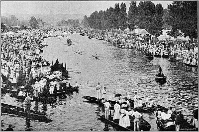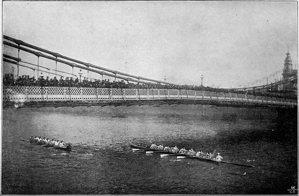 which seems, if the criticism may be permitted, a curious proceeding even for a stricken rock during the progress of a boat-race. Finally, a touch of religious romance is added when we learn that the final result was due, not to the unaided efforts of the straining crew, but to the intervention of Portunus, the Harbour God, who, moved by the prayer of Cloanthus, captain of the Scylla, pushed that barque along and carried her triumphantly[Pg 8] first into the haven—invidious conduct which does not appear to have caused the least complaint amongst the defeated crews, or to have prevented Cloanthus from being proclaimed the victor of the day. Only on one occasion (in 1859) has Father Thames similarly exerted himself to the advantage of one of the University crews, for during the boat-race of that year he swamped the Cambridge ship beneath his mighty waves, and sped Oxford safely to Mortlake. Lord Justice A. L. Smith, amongst others, still lives, though he was unable to swim, to tell the exciting tale.
