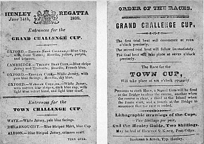 Of the early history of boats and boat-racing it is not necessary to say very much. It is enough to know that the written Cambridge records date back to 1827, though it is certain that racing must have begun some years previously; that Oxford can point to 1822 as one of the earliest years of their College races; that the two Universities raced against one another for the first time in 1829; and that Henley Regatta was established[Pg 6] in 1839, when the Grand Challenge Cup was won by First Trinity, Cambridge. Opposite is a facsimile copy of the programme of this memorable regatta.