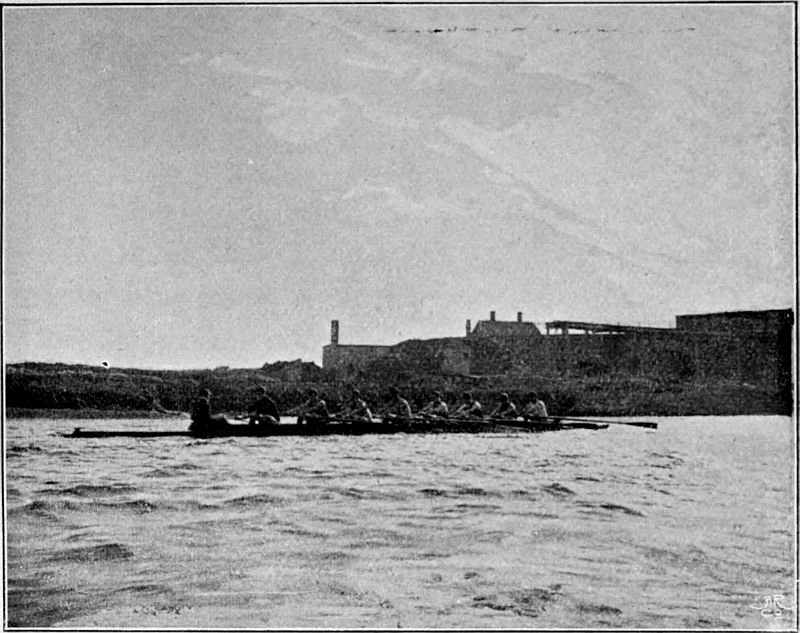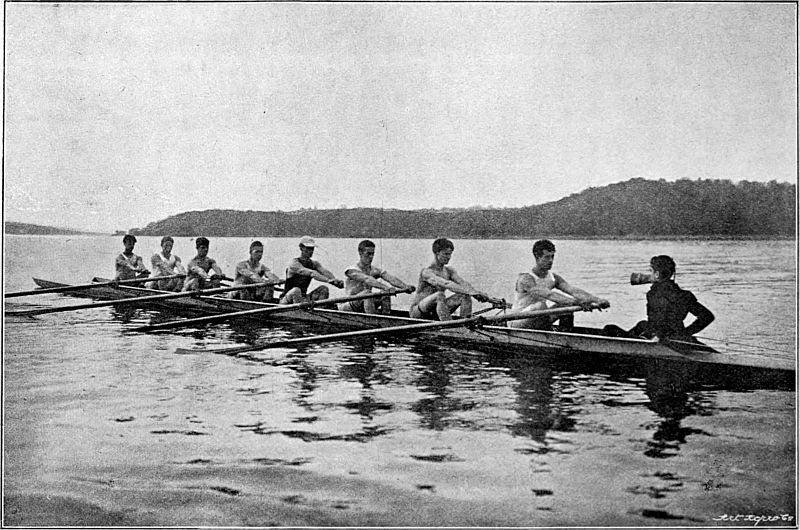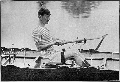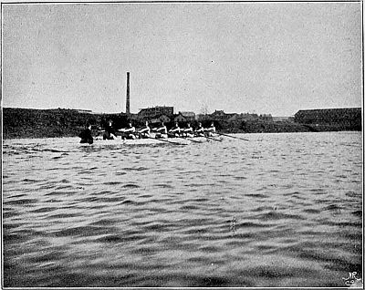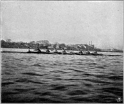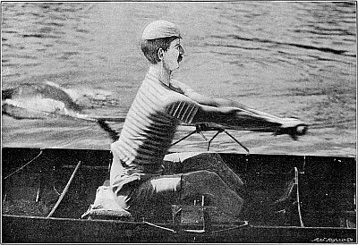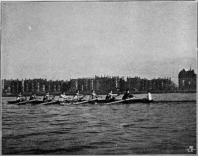 So much for the trireme. But neither the Greeks nor any other race thought of adapting their boats merely to purposes of racing until the English, with their inveterate passion for open-air exercise, took the matter in hand. African war-canoes have been known to race, but their primary object is still the destruction of rival canoes together with their dusky freight. In Venice the gondoliers are matched annually against one another, but both the gondola and the sandolo remain what they always have been—mere vessels for the conveyance of passengers and goods. The man who would make war in a racing ship would justly be relegated to Hanwell, and to carry passengers, or even one "passenger," in such a boat is generally looked upon as a certain presage[Pg 10] of defeat. Consider for a moment. The modern racing ship (eight, four, pair, or single) is a frail, elongated, graceful piece of cabinet work, held together by thin stays, small bolts, and copper nails, and separating you from the water in which it floats by an eighth of an inch of Mexican cedar. The whole weight of the sculling-boat, built by Jack Clasper, in which Harding won the Searle Memorial Cup, was only nineteen pounds, i.e. about 112 pounds lighter than the man it carried. Considering the amount of labour and trained skill that go towards the construction of these beautiful machines, the price cannot be said to be heavy. Most builders will turn you out a sculling-boat for from £12 to £15, a pair for about £20, a four for £33, and an eight for £55. But the development of the racing type to its present perfection has taken many years. Little did the undergraduates who, in 1829, drove their ponderous man-of-war's galleys from Hambledon Lock to Henley Bridge, while the stricken hills of the Thames Valley rebounded to the shouts of the spectators—little did they imagine that their successors, rowing on movable seats and with rowlocks projecting far beyond the side[Pg 11] would speed in delicate barques, of arrowy shape and almost arrowy swiftness, from Putney to Mortlake—in barques so light and "crank" that, built as they are without a keel, they would overturn in a moment if the balance of the oars were removed. The improvements were very gradual. In 1846 the University race was rowed for the first time in boats with outriggers. That innovation had, however, been creeping in for some years before that. Mr. Hugh Hammersley, who rowed in the Oriel boat which started head of the river at Oxford in 1843, has told me that in that year the University College boat, stroked by the famous Fletcher Menzies, was fitted with outriggers at stroke and bow; and the bump by which University displaced Oriel was generally ascribed to the new invention.