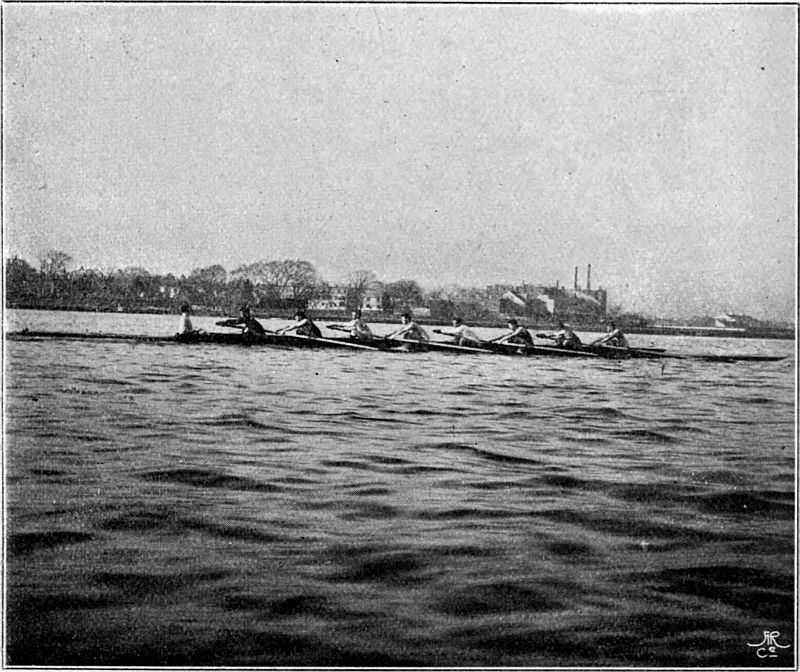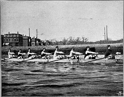 One might have thought that with this invention improvements would have ceased. But in course of time the practical experience of rowing men suggested to them that if they slid on their seats, both the length and power of their stroke through the water would be increased. At first they greased their fixed seats, and slid on those. But it was found that the strain caused by this method exhausted a crew. In 1871 a crew of professionals used a seat that slid on the thwarts, and beat a crew that was generally held to be superior, and from that moment slides, as we now know them, came into general use. In 1873 the University[Pg 13] crews rowed on sliding seats for the first time. Since then the length of the slide has been increased from about nine inches to fifteen inches, or even more, a change which has made the task of the boat-builder in providing floating capacity more difficult; but in all essentials the type of boat remains the same. It ought to be added that the Americans, to a large extent, use boats moulded out of papier maché, but this variation has never obtained favour in England, though boats built in this manner by the well-known Waters of Troy (U.S.A.) have been seen on English rivers. The Columbia College crew won the Visitors' Cup at Henley in 1878 in a paper boat, and she was afterwards bought by First Trinity, Cambridge, but she never won a race again.