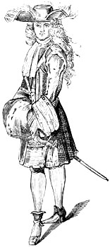 Thomas Brown, in his “Letters from the Dead to the Living” presents a pen portrait of beaux, as they appeared at the commencement of the eighteenth century. Some of the passages are well worth reproducing, as they contain valuable information concerning wigs. “We met,” says the writer, “three flaming beaux of the first magnitude. He in the middle made a most magnificent figure—his periwig was large enough to have loaded a camel, and he bestowed upon it at least a bushel of powder, I warrant you. His sword-knot dangled upon the ground, and his steinkirk, that was most agreeably discoloured with snuff from the top to the bottom, reach’d down to his waist; he carry’d his hat under his left arm, walk’d with both hands in the waistband of his breeches, and his cane, that hung negligently down in a string from his right arm, trail’d most harmoniously[Pg 12] against the pebbles, while the master of it was tripping it nicely upon his toes, or humming to himself.” Down to the middle of the eighteenth century, wigs continued to increase in size.