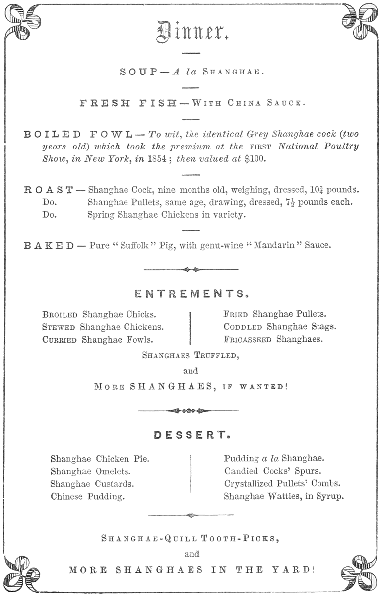 | IX. | The Second Poultry Show in Boston | 52 | XXXIII. | The Essence of Humbug | 224 |